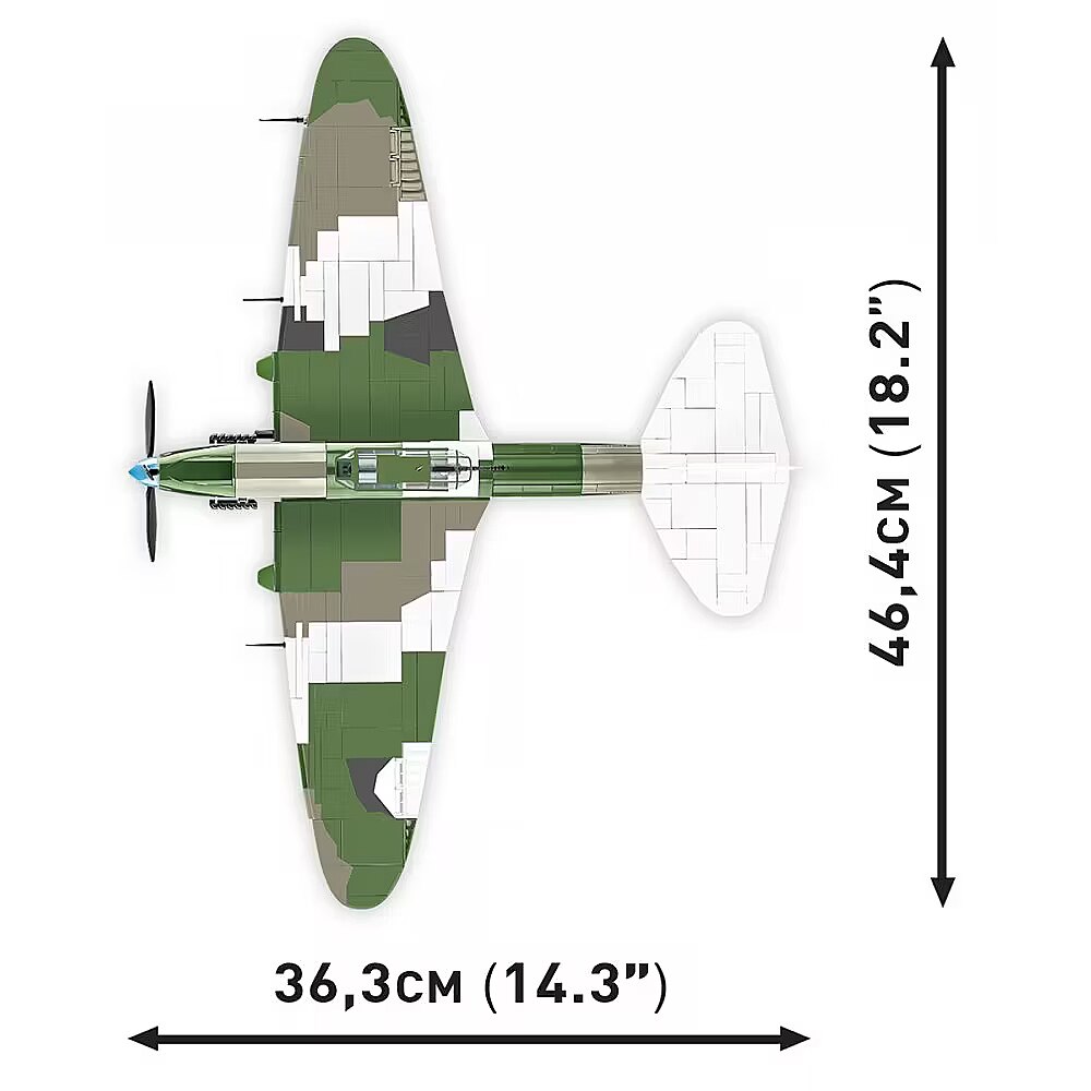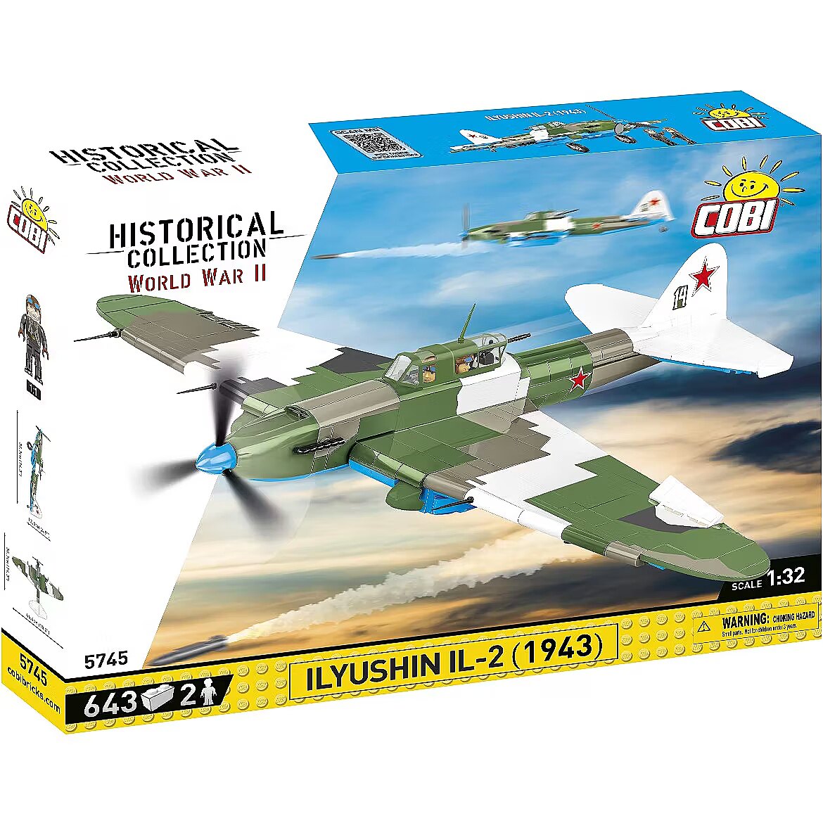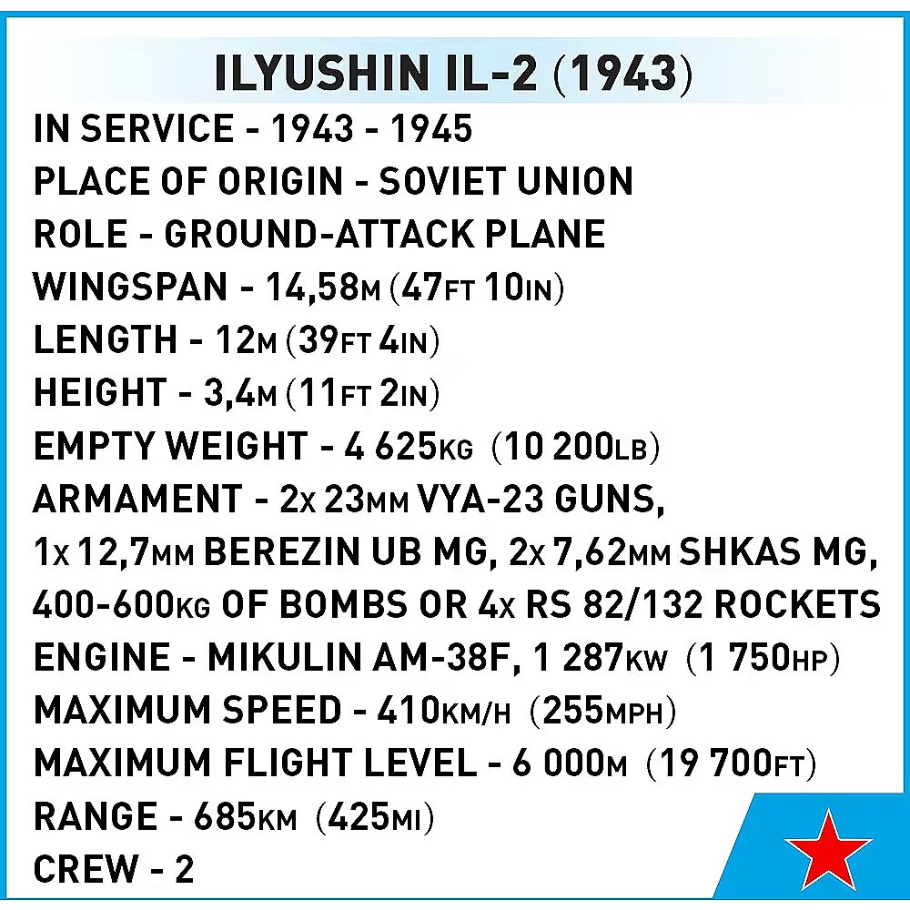 Description - One of the most famous planes from World War II, the IL-2 was designed and mass-produced in the USSR starting in 1941. Production of subsequent versions of the Il-2 was canceled only a few years after the war. In total, about 36,000 of these aircraft were built. The initial versions struggled with many problems and were replaced in 1942-43 by Il-2 aircraft with a two-man crew, more powerful engines and reinforced armament. This model presents the original design of the wings, which was completely different than in the slightly later IL-2M3 model, in which they got a more aggressive angle of attack. In the West, the plane gained the popular name "Shturmovik." The IL-2 aircraft was designed from COBI construction blocks in the scale of 1:32 using new elements. The block model offers many movable elements such as a rotating propeller, movable wing ailerons and wheels with rubber tires that can be folded to a horizontal position. Details and historical winter camouflage have been reproduced. The blue underside of the plane definitely draws attention. The cockpit canopy has been redesigned and can be opened to seat the pilot and gunner figures in the seats. Thanks to a special display stand with a plate containing the name of the plane and a place to attach the figures, the whole set looks fantastic! The model uses durable prints and historical markings. The set completes the collection of WWII planes issued in 1:32 scale, intended for enthusiasts of history, military technology and fans of the highest quality block modeling! 643 high-quality elements Manufactured in the EU by a company with over 20 years of tradition The blocks meet the safety standards of products for children Fully compatible with other brands of construction blocks Blocks with prints do not scratch or smear and do not fade during play or under the influence of temperature Clear and intuitive instructions based on illustrations and step-by-step directions Two figures: a pilot and a gunner Special display stand with a plate