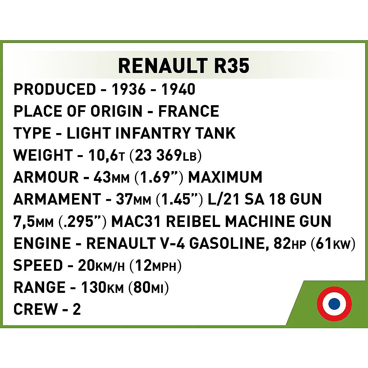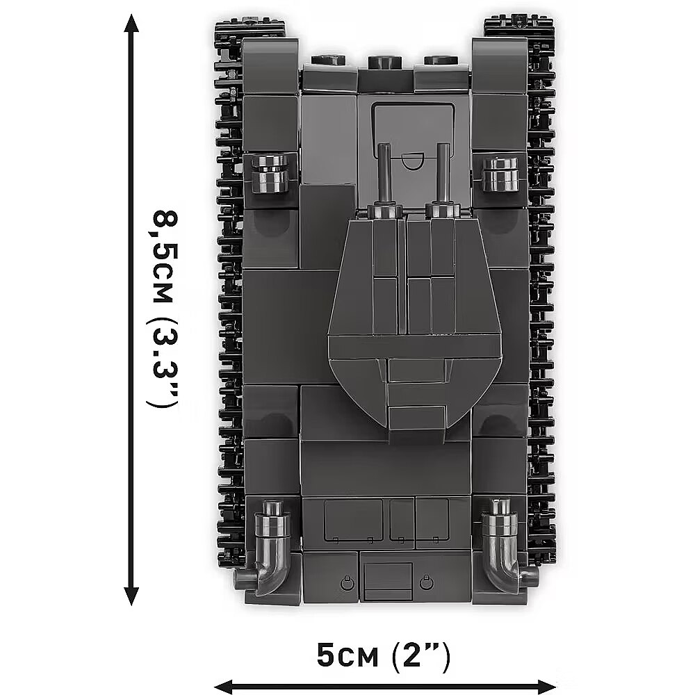 Apraksts - Renault R35 - Valentine IX - Panzer I Trīs vēsturisko Otrā pasaules kara tanku reprezentācija, kas atlasīti no ievērojamās Eiropas lielāko bruņutehnikas muzeju ekspozīcijas! No viena COBI ķieģeļu komplekta jūs uzbūvēsiet: Vācu Panzer I vieglo tanku no Deutsches Panzermuseum Munster Franču Renault R35 bāzes tanku no Musée des Blindés Tanku modeļi ir rūpīgi izstrādāti no augstākās kvalitātes COBI klucīšiem vienotā mērogā 1:48 un atbilst pēc izmēra. Būvblokiem ir kustīgi riteņi un kāpurķēdes, kā arī torņi, kurus var pagriezt par 360 grādiem. Uz klucīšiem ir uzdrukāti atšķirīgi transportlīdzekļu marķējumi un detaļas. Vēsturisko tanku modeļus ir viegli būvēt. Vienkāršs un intuitīvs konstruēšanas ceļvedis ved jūs cauri visam būvēšanas procesam, bet beigās ir detaļu saraksts. Uzbūvēts britu vieglais tanks "Valentine" ir 14 cm (5,5") garš. Starpkaru periodā projektētais vācu vieglais tanks Panzer I ir 8,5 cm (3,3") garš, kad tas ir uzbūvēts. Franču R35 bāzes tanka, kas tika konstruēts 1930. gados, garums ir 9 cm (3,5"). Ķieģeļu tanku komplekts ir ideāls sākumkomplekts, lai sāktu apbrīnojamu vēsturisko transportlīdzekļu kolekciju no COBI! Šis komplekts ir lielisks suvenīrs, ko izgatavot pašu rokām, un atmiņas par neaizmirstamu milzīga tanku muzeja apmeklējumu. Transportlīdzekļi lieliski iederēsies gan kolekcionāra plauktā vai uz galda, gan kā rotaļlieta mazajiem militārās tehnikas cienītājiem. Ja esat pieredzējis klucīšu būvētājs, modeļi nodrošinās jums ļoti interesantus darbiņus. Izpaudiet savu aizraušanos ar klucīšiem un veidojiet vēsturi klucīti pa klucītim! 595 augstas kvalitātes detaļas Ražots ES, uzņēmums ar vairāk nekā 20 gadu tradīcijām Atbilst bērnu produktu drošības standartiem Pilnībā saderīgs ar citu zīmolu būvķieģeļiem Apdrukātie ķieģelīši nedeformējas un neizbalē ne spēles laikā, ne temperatūras ietekmē Skaidras un intuitīvas instrukcijas, kas balstītas uz zīmējumiem un ikonām Britu tanka Valentine IX modelis no The Tank Museum Vācu tanku Panzer I modelis no Deutsches Panzermuseum Munster Francijas tanku Renault R35 modelis no Musée des Blindés.