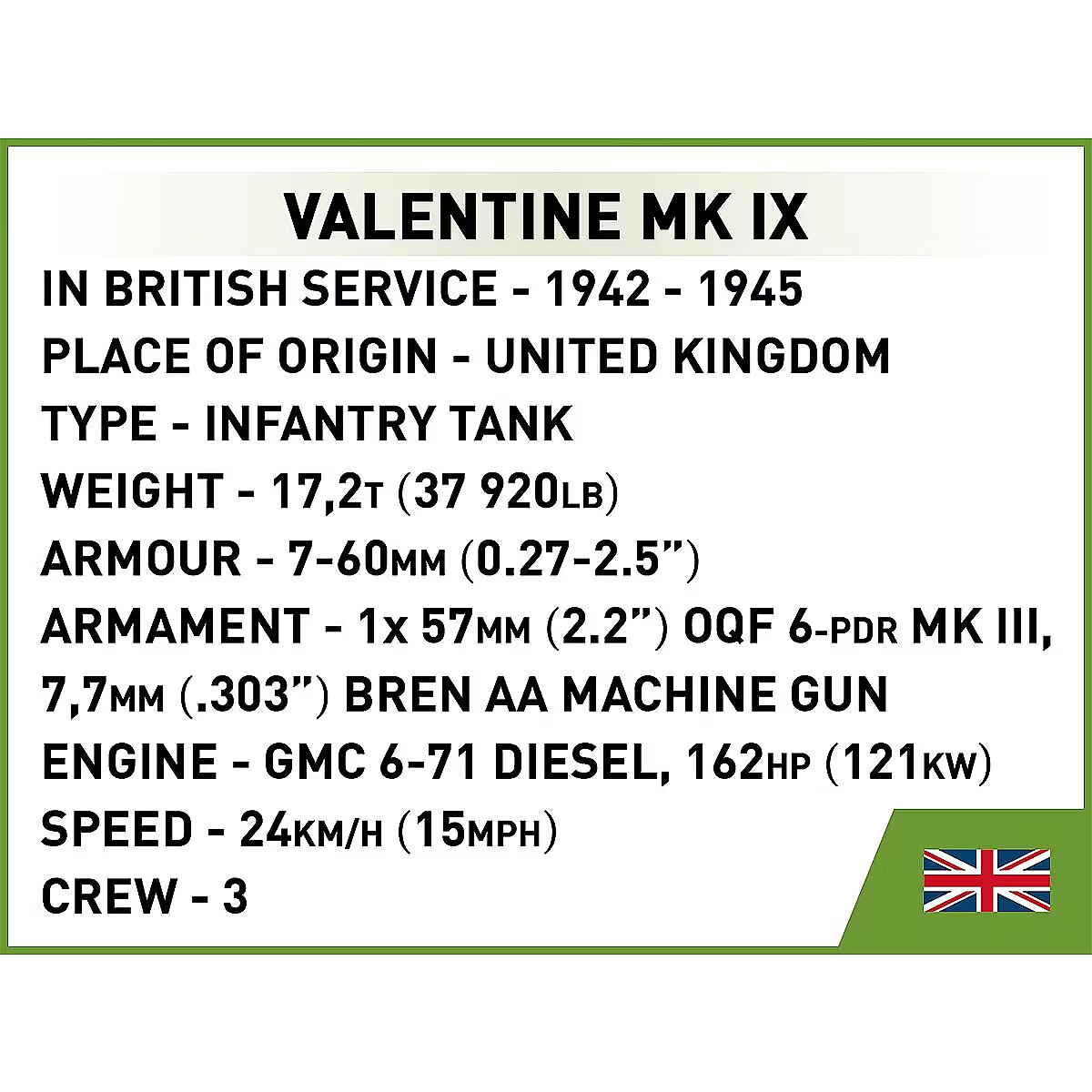 Izmēri - Tanks Valentine IX (garums x augstums): 14,5 cm (5,7") x 7 cm (2,7") Tanks Panzer I (garums x augstums): 8,5 cm (3,3") x 4,5 cm (1,8") Tanks Renault R35 (garums x augstums): 9 cm (3,5") x 5,5 cm (2,2").