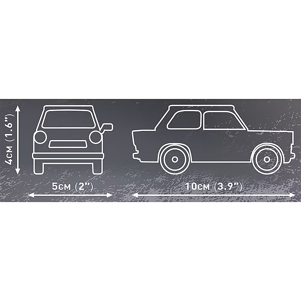 Apraksts - Trabant 601 Kultisks un ārkārtīgi populārs Vācijas Demokrātiskās Republikas automobilis. Tā racionālās formas savulaik raisīja apbrīnu un skaudību. Četrvietīgais Trabant 601 spēja paātrināties līdz galvu reibinošam 100 km/h ātrumam. 1:35 mēroga modelis, kas sastāv no 100% COBI klucīšiem, precīzi atveido oriģinālā Trabant 601 racionālās formas un ļauj veikt nelielas modifikācijas un pārveidojumus. Tas ir lieliski piemērots gan kolekcionāra plauktam, gan spēlēšanai. 72 augstas kvalitātes elementi Ražots Eiropas Savienībā uzņēmumā ar vairāk nekā 20 gadu tradīcijām Atbilst bērnu produktu drošības standartiem Pilnībā saderīgs ar citu zīmolu konstruktoru klucīšiem Klucīši ar apdruku nedeformējas un neizbalē ne spēles laikā, ne temperatūras ietekmē Skaidra un intuitīva instrukcija, kas balstīta uz zīmējumiem un ikonām Klucītis ar uzdrukātu modeli un automašīnas nosaukumu.