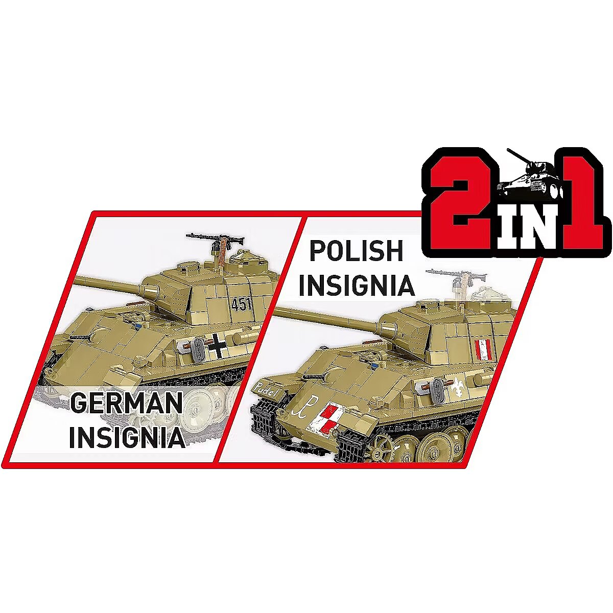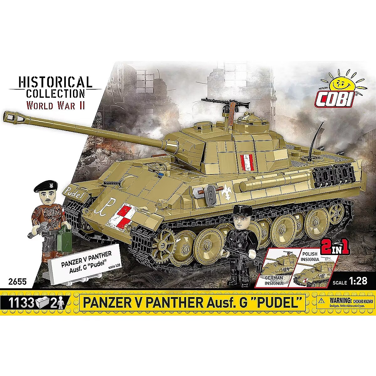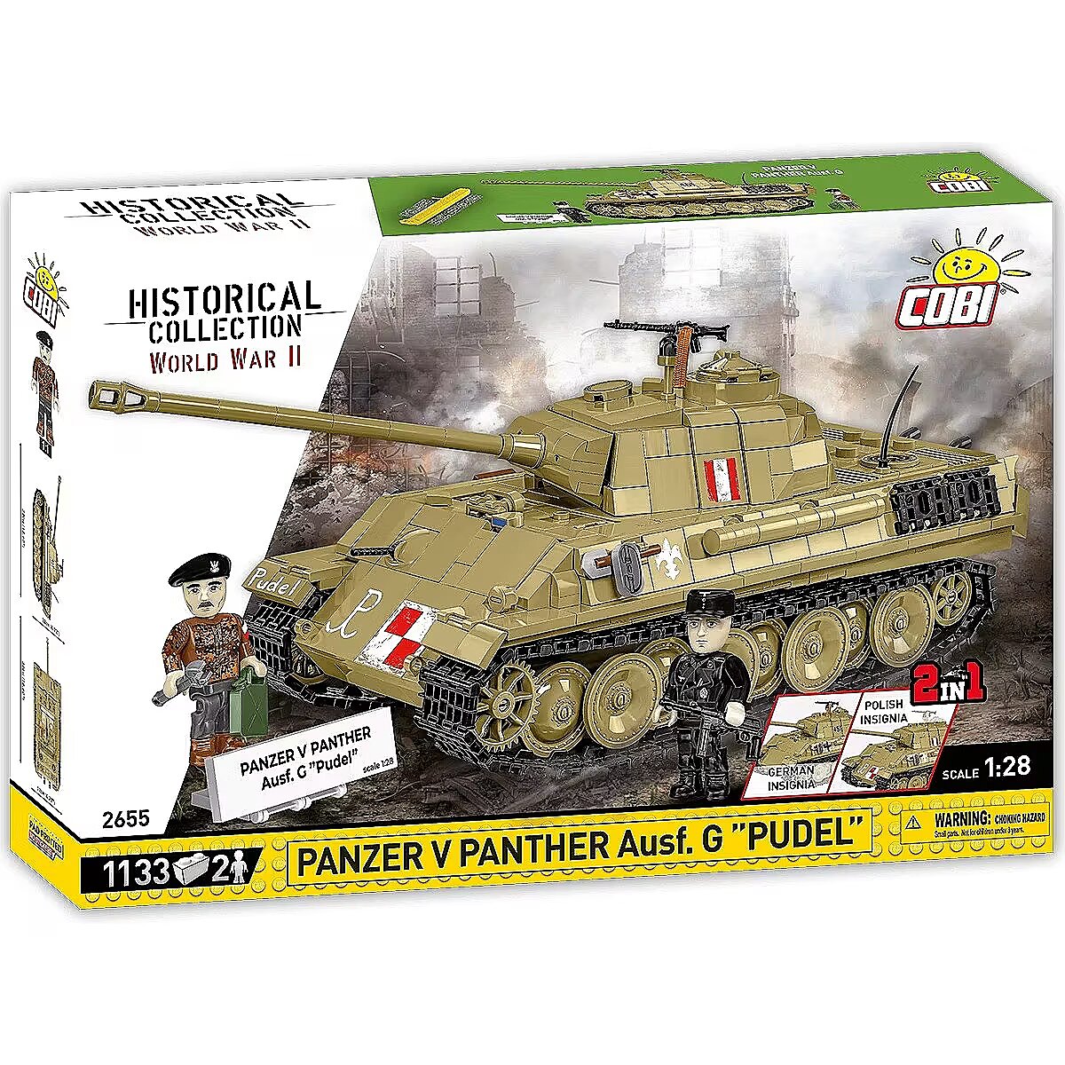 Description - Klocki Panzer V Panther G Pudel 1133 klocków Zbuduj Panzer V PANTHER Ausf.G Pudel od COBI krok po kroku i poczuj, jak ten legendarny pojazd ożywa w Twoich rękach! Konstruując ten czołg, stworzysz imponujący model, który zachwyci każdego miłośnika klocków, kolekcjonera i pasjonata historii Panzer V PANTHER Ausf.G to jeden z najważniejszych niemieckich czołgów II wojny światowej, a jego wersja Pudel zyskała szczególne znaczenie w historii Polski, kiedy to czołg został zdobyty przez powstańców warszawskich w sierpniu 1944 roku. Interaktywna zabawa i realizm - model wyposażony jest w ruchome działo, otwieraną klapę oraz obrotową i wyjmowaną wieżę czołgową, co zapewnia wyjątkowy realizm i umożliwia kreatywną zabawę. Realistyczna konstrukcja - w zestawie znajdziemy wyjmowany silnik Maybach HL-230, który można wyeksponować obok modela. Precyzyjne detale historyczne - zestaw zawiera szczegółowe odwzorowanie karabinów maszynowych oraz gąsienic, które są inspirowane autentycznym sprzętem z II wojny światowej, co czyni model wyjątkowo realistycznym. Kolekcjonerski wymiar - dwie figurki - niemieckiego czołgisty oraz Polaka Jana Uniewskiego ps. Lumeński który uruchomił zdobyczny czołg w czasie Powstania Warszawskiego, dodają wyjątkowego kontekstu historycznego. Przydomek Pudel - czołg go otrzymał na cześć oficera Tadeusza Tyczyńskiego, który zginął podczas walk, a model oddaje hołd tym, którzy walczyli o wolność Polski. Łatwy i satysfakcjonujący proces budowy - dzięki szczegółowej instrukcji budowa czołgu jest prosta i przyjemna, a wysokiej jakości klocki COBI gwarantują precyzyjne dopasowanie i trwałość modelu. Kreatywność i satysfakcja - doskonale wyprofilowane elementy sprawiają, że łączenie klocków jest łatwe i przyjemne, a efekt końcowy daje ogromną satysfakcję z wykonania precyzyjnego, historycznego modelu. Emblematy narodowe - model posiada emblematy narodowe Polski, takie jak symbol Polski Walczącej i lilia harcerska. Możliwość wymiany na emblematy niemieckie daje Ci pełną swobodę w dostosowywaniu modelu. Rozbudowa kolekcji - sprawdź inne pojazdy z serii HISTORICAL COLLECTION World War II i stwórz własną, unikalną kolekcję historycznych maszyn! Panzer V PANTHER Ausf.G Pudel to idealna okazja, by zbudować jeden z najbardziej znanych pojazdów wojskowych w historii Powstania Warszawskiego, zgłębiając przy tym fascynujące tajemnice przeszłości. Zestaw to także świetny wybór dla dorosłych kolekcjonerów, którzy docenią wysoką jakość i dbałość o detale. Wyprodukowane w UE przez firmę z ponad 35-letnią tradycją Spełniają normy bezpieczeństwa dotyczące produktów dla dzieci W pełni kompatybilne z innymi markami klocków konstrukcyjnych Czytelna i intuicyjna instrukcja oparta na rysunkach i ikonach