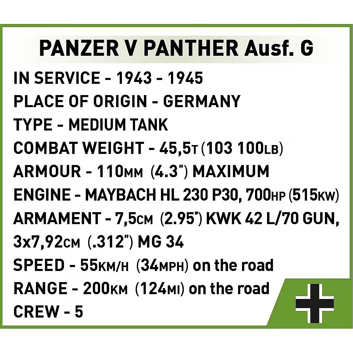 Apraksts - Panzer V Panther G Poodle 1133 ķieģeļi Soli pa solim uzbūvējiet Panzer V PANTHER Ausf.G Poodle no COBI un sajūtiet, kā šis leģendārais transportlīdzeklis atdzīvojas jūsu rokās! Būvējot šo tanku, jūs izveidosiet iespaidīgu modeli, kas iepriecinās ikvienu ķieģeļu mīļotāju, kolekcionāru un vēstures entuziastu Panzer V PANTHER Ausf.G ir viens no nozīmīgākajiem vācu tankiem Otrā pasaules kara laikā, un tā Pudeļa versija ieguva īpašu nozīmi Polijas vēsturē, kad 1944. gada augustā šo tanku sagrāba Varšavas nemiernieki. Interaktīva izklaide un reālisms - modelim ir kustīgs lielgabals, atverama lūka un rotējošs un noņemams tanku tornis, kas nodrošina izcilu reālismu un radošu spēli. Reālistisks dizains - komplektā iekļauts noņemams Maybach HL-230 dzinējs, ko var izstādīt blakus modelim. Precīzas vēsturiskās detaļas - komplektā ietilpst detalizēti atveidoti ložmetēji un kāpurķēdes, kas veidotas, iedvesmojoties no autentiska Otrā pasaules kara aprīkojuma, padarot modeli ārkārtīgi reālistisku. Kolekcionāra dimensija - divas figūriņas - vācu tanka vadītāja un poļa Jan Uniewski, pazīstams arī kā Lumeński, kurš Varšavas sacelšanās laikā palaida sagūstīto tanku, - papildina unikālu vēsturisko kontekstu. Tanks tika iesaukts par Pudel par godu kaujās kritušajam virsniekam Tadeušam Tičinskim (Tadeusz Tyczynski), un modelis ir veltījums tiem, kas cīnījās par Polijas brīvību. Viegls un apmierinošs būvēšanas process - pateicoties detalizētai instrukcijai, tanka būvēšana ir vienkārša un aizraujoša, un augstas kvalitātes COBI ķieģeļi garantē precīzu montāžu un modeļa izturību. Radošums un gandarījums - perfekti veidoti elementi padara bloku savienošanu vieglu un patīkamu, un galarezultāts sniedz lielu gandarījumu par precīza, vēsturiska modeļa izgatavošanu. Valsts emblēmas - modelī ir Polijas valsts emblēmas, piemēram, karojošās Polijas simbols un skautu lilija. Iespēja tās aizstāt ar Vācijas emblēmām sniedz pilnīgu brīvību modeļa pielāgošanā. Paplašiniet savu kolekciju - iepazīstieties ar citiem transportlīdzekļiem HISTORICAL COLLECTION Otrā pasaules kara sērijā un izveidojiet savu unikālu vēsturisko mašīnu kolekciju! Panzer V PANTHER Ausf.G Pūdele ir lieliska iespēja izveidot vienu no slavenākajiem militārajiem transportlīdzekļiem Varšavas sacelšanās vēsturē, vienlaikus pētot aizraujošus pagātnes noslēpumus. Šis komplekts ir lieliska izvēle arī pieaugušajiem kolekcionāriem, kuri novērtēs augsto kvalitāti un uzmanību detaļām. Ražots Eiropas Savienībā uzņēmumā ar vairāk nekā 35 gadu tradīcijām Atbilst bērnu produktu drošības standartiem Pilnībā saderīgs ar citu zīmolu konstruktoriem Skaidras un intuitīvas instrukcijas, kuru pamatā ir zīmējumi un ikonas.