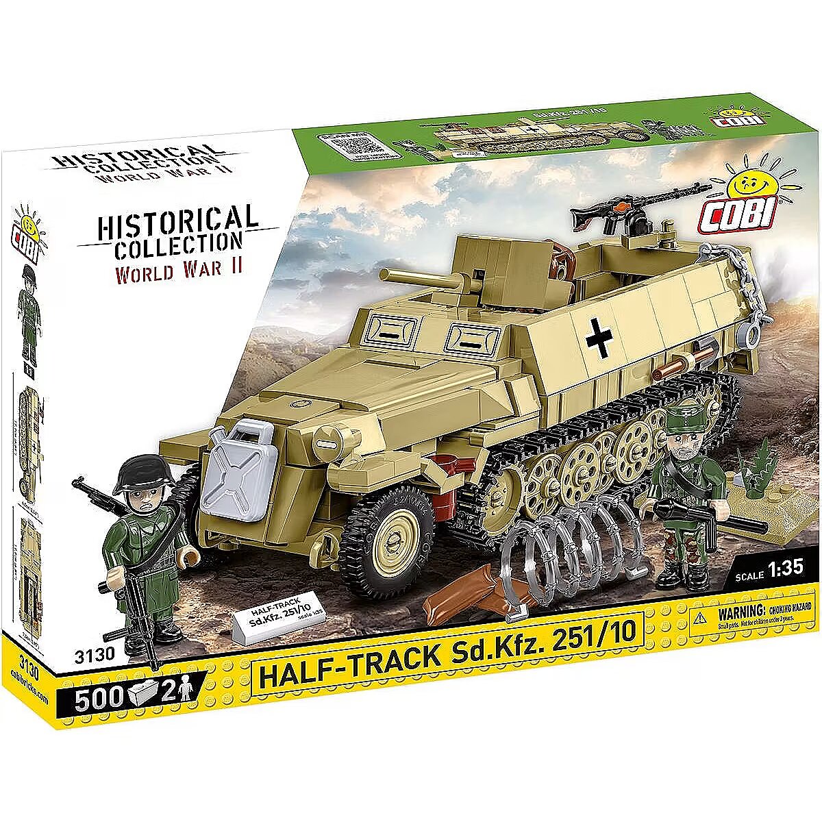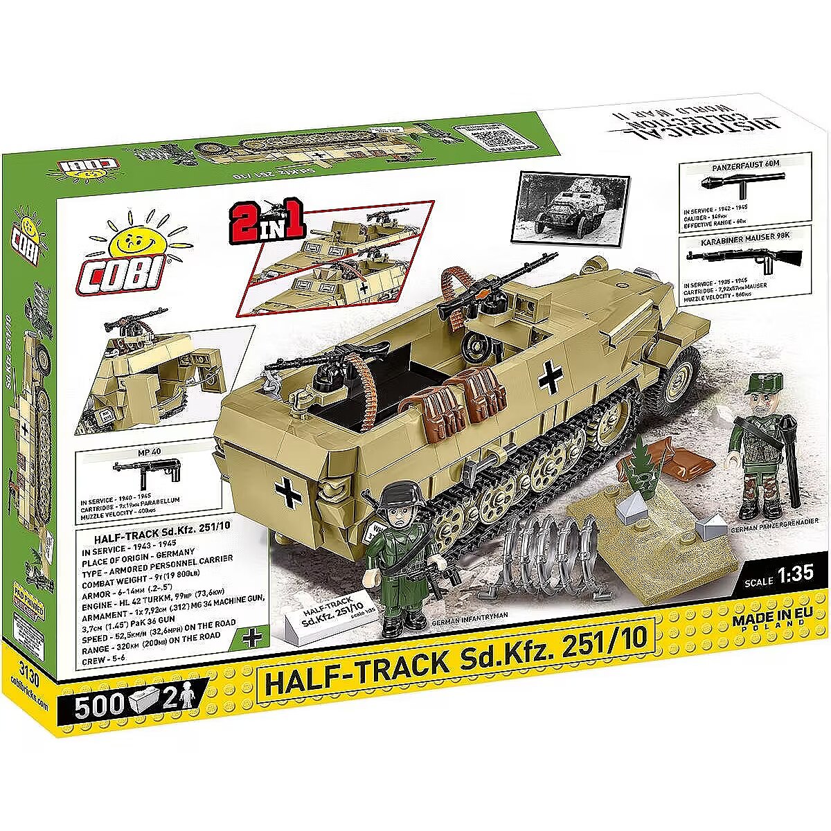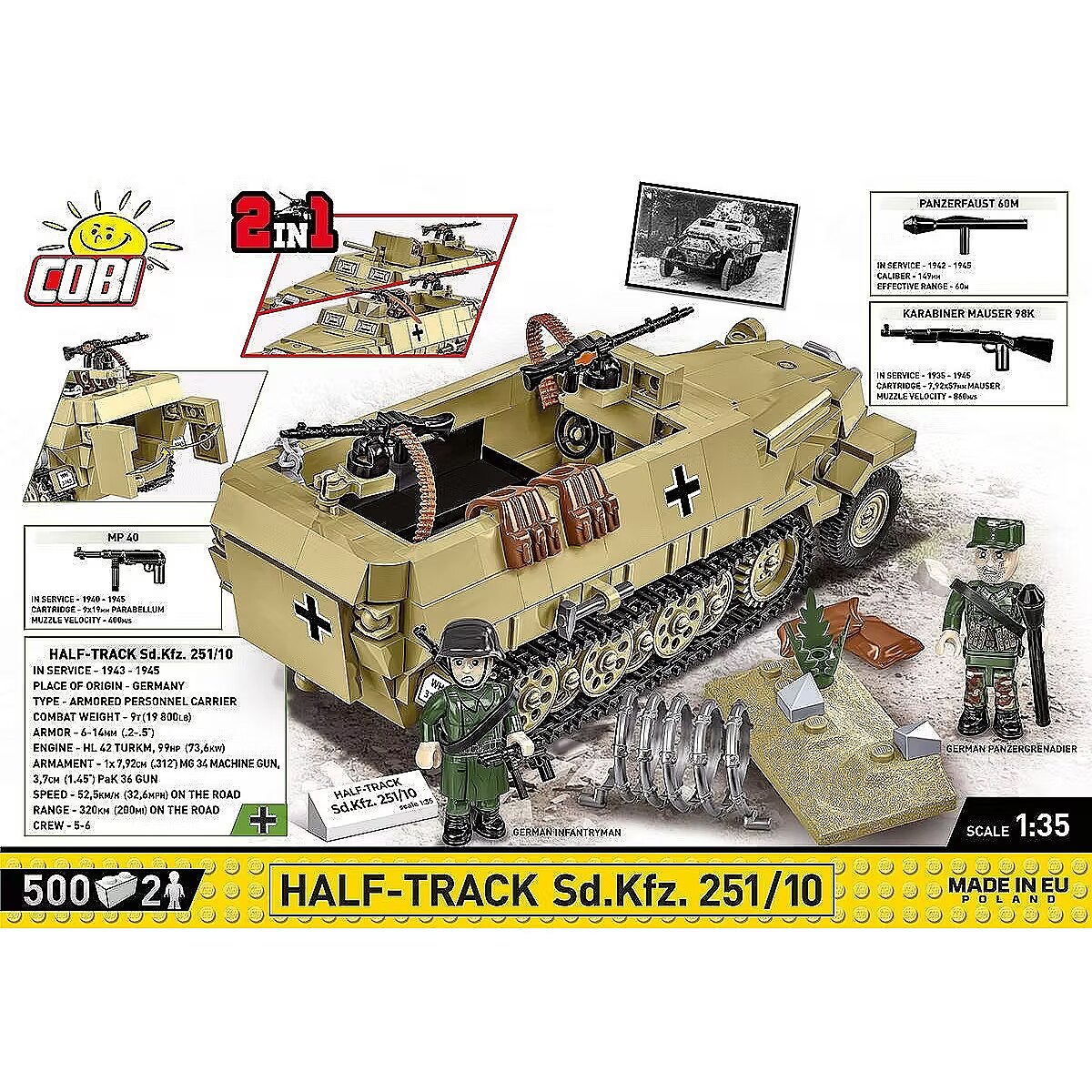 Description - Klocki Half-Truck Sd.Kfz.251 500 klocków Półgąsienicowy transporter opancerzony Sd. Kfz. 251 w wersji 2 w 1 został wiernie odwzorowany przy użyciu klocków konstrukcyjnych COBI! Podczas budowy możesz wyposażyć go w armatę Pak 36 lub dwa karabiny maszynowe MG 34! Tutaj nie ma naklejek, stosujemy wyłącznie wysokiej jakości trwałe nadruki. Pojazd posiada ruchome koła z prawdziwymi oponami. Trakcja gąsienicowa składająca się z realistycznych klockowych ogniw pracuje i zachowuje się jak prawdziwa w trakcie poruszania pojazdem. Otwierane tylne drzwi, dwa karabiny maszynowe, armatka oraz akcesoria dodatkowe uatrakcyjniają zabawę transporterem. Całość zestawu uzupełniają figurki. Pierwsza przedstawia żołnierza piechoty w długim płaszczu. Druga figurka to grenadier pancerny. Żołnierze są wyposażeni w nakrycia głowy, klocek imitujący puszkę na maskę przeciwgazową i manierkę, pasy nośne na broń, pistolet maszynowy MP 40 oraz granatnik przeciwpancerny Panzerfaust i karabin Mauser. Zestaw został opracowany z dbałością o detale i jest również doskonałym rozwinięciem popularnej kolekcji Historical Collection!