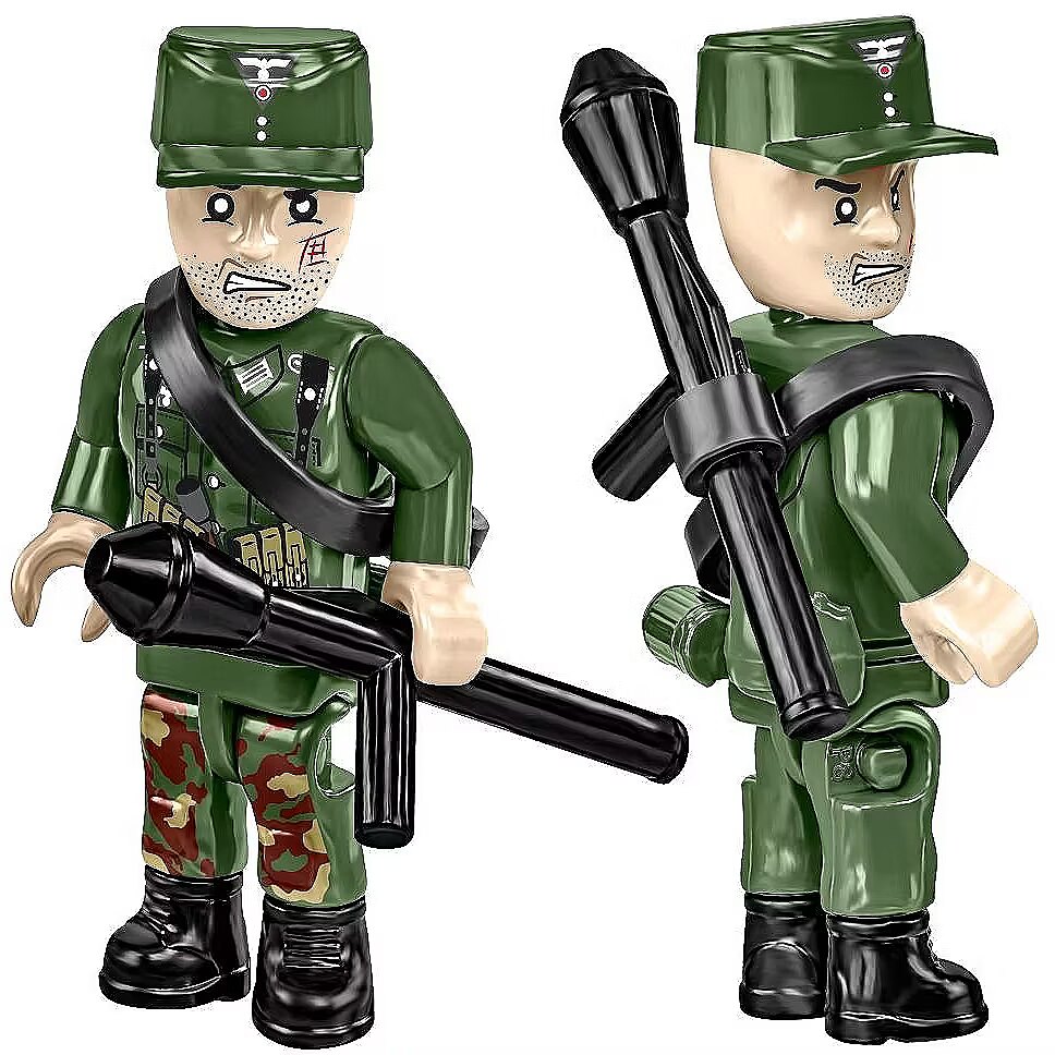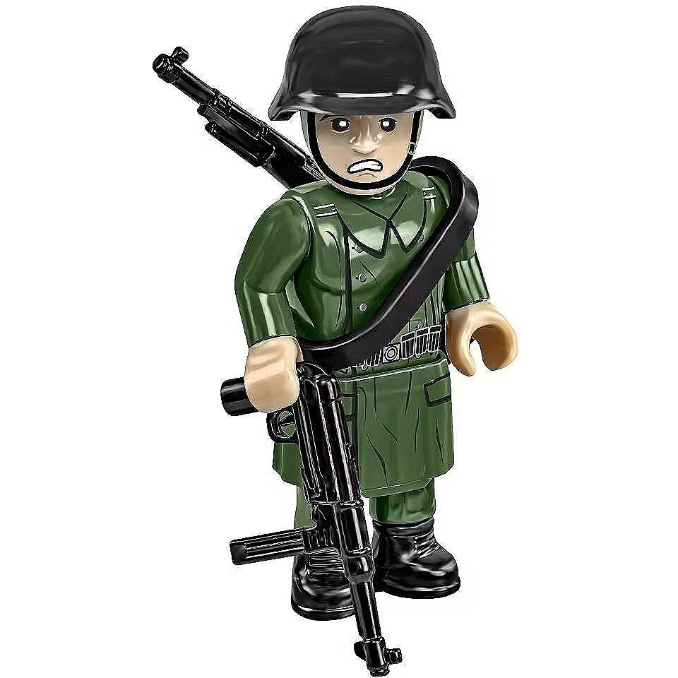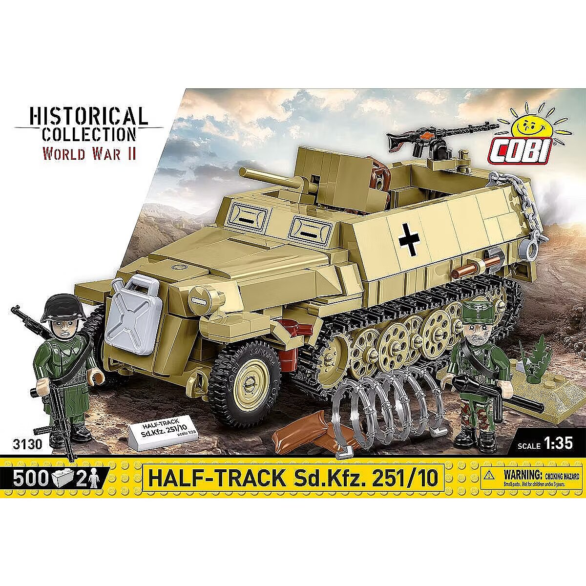 Description - Klocki Half-Truck Sd.Kfz.251 500 klocków Półgąsienicowy transporter opancerzony Sd. Kfz. 251 w wersji 2 w 1 został wiernie odwzorowany przy użyciu klocków konstrukcyjnych COBI! Podczas budowy możesz wyposażyć go w armatę Pak 36 lub dwa karabiny maszynowe MG 34! Tutaj nie ma naklejek, stosujemy wyłącznie wysokiej jakości trwałe nadruki. Pojazd posiada ruchome koła z prawdziwymi oponami. Trakcja gąsienicowa składająca się z realistycznych klockowych ogniw pracuje i zachowuje się jak prawdziwa w trakcie poruszania pojazdem. Otwierane tylne drzwi, dwa karabiny maszynowe, armatka oraz akcesoria dodatkowe uatrakcyjniają zabawę transporterem. Całość zestawu uzupełniają figurki. Pierwsza przedstawia żołnierza piechoty w długim płaszczu. Druga figurka to grenadier pancerny. Żołnierze są wyposażeni w nakrycia głowy, klocek imitujący puszkę na maskę przeciwgazową i manierkę, pasy nośne na broń, pistolet maszynowy MP 40 oraz granatnik przeciwpancerny Panzerfaust i karabin Mauser. Zestaw został opracowany z dbałością o detale i jest również doskonałym rozwinięciem popularnej kolekcji Historical Collection!