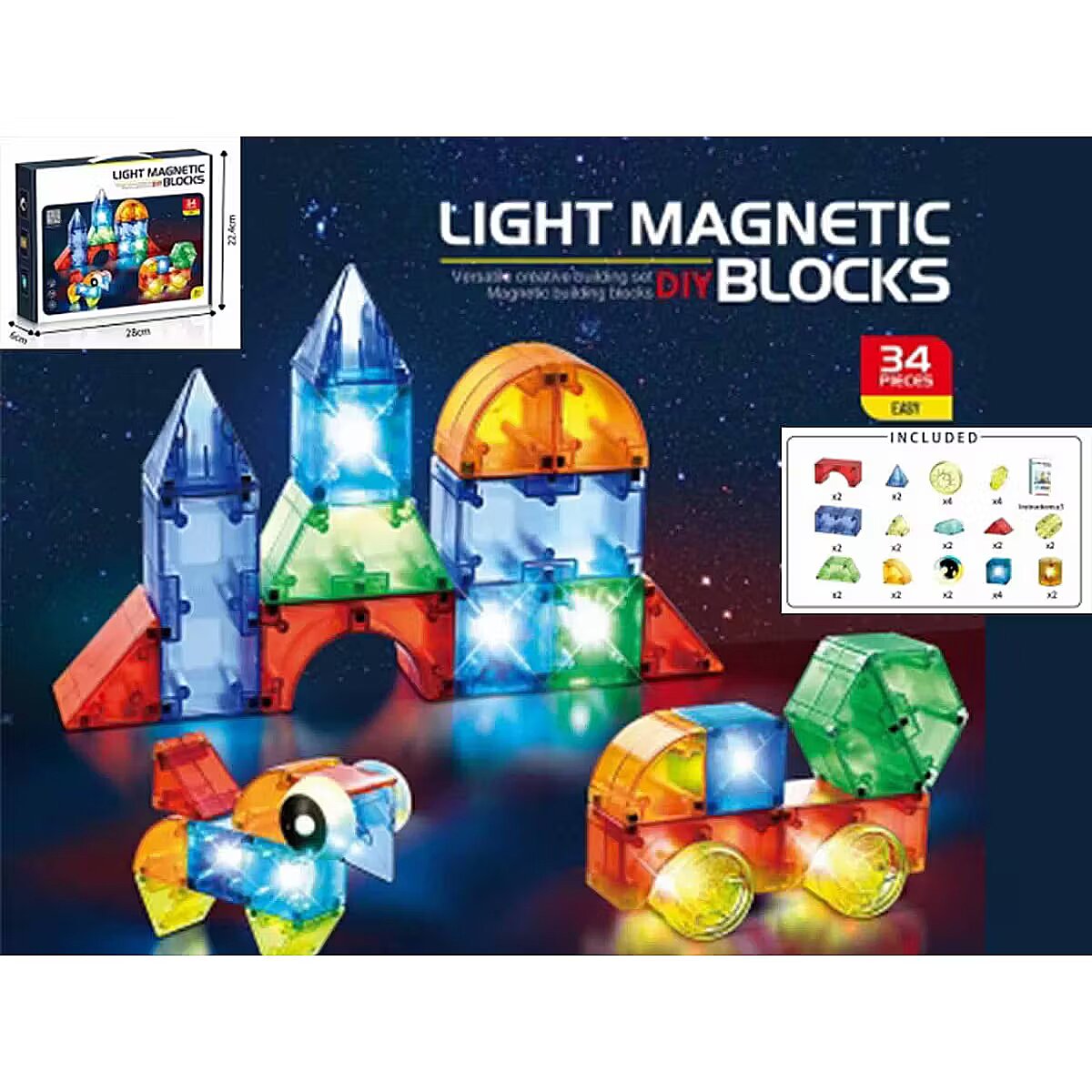 Description - Light-Up Magnetic Building Blocks - 32 Pieces Create your own glowing world full of creativity! Light Magnetic DIY Blocks are colorful, illuminated magnetic pieces that allow children to build 3D constructions - from towers and vehicles to animals and futuristic buildings. The perfect combination of learning, play, and WOW effects! Key product features: 32 pieces in various shapes LED lighting - constructions glow during play Strong magnets ensure stable connections Transparent, colorful pieces - beautiful lighting effects Supports STEM learning (logic, spatial awareness, creativity) Ability to build hundreds of models Safe, rounded edges Benefits for children: Develops creativity and spatial thinking Supports concentration and fine motor skills Stimulates scientific curiosity Allows for solo or group play Ideal for home or preschool use
