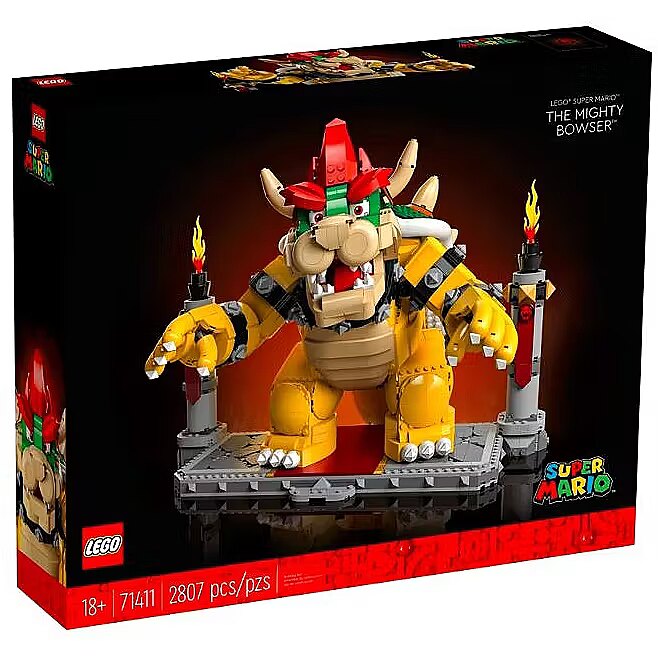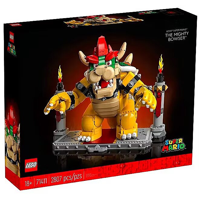 Technical_details - Type: construction toy EAN: 5702017155319 Manufacturer number: 71411 Series: Super Mario Parts: 2807 pieces Contents/Features: LEGO® Super Mario™ The Mighty Bowser (71411) set with a fireball shooter, posable arms and fingers and a button to control head and neck movements. Platform with hidden POW block, a function brick, 2 towers, step-by-step building instructions. Age recommendation: from 18 years Target audience: adults Material: Plastic Warnings: Caution: Not suitable for children under 36 months! : Attention: Danger of suffocation due to small parts! Additional Info: Build the highly detailed LEGO® brick model of the mighty Bowser, then display the figure on a dueling platform with hidden POW block.