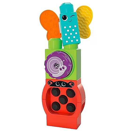 LongDesc - Little builders will move and groove alongside this adorable caterpillar train. Toddlers can build a caterpillar train with motion and chain blocks, and a pull string in the front to get it rolling. Then, they can add a ladybug with a pop block, snail with a turn and click feature, and a butterfly with textured wings on the caterpillar’s back to come along for the ride. Toddlers can also discover a mirror flower, textured antennas, and a bee bead block.