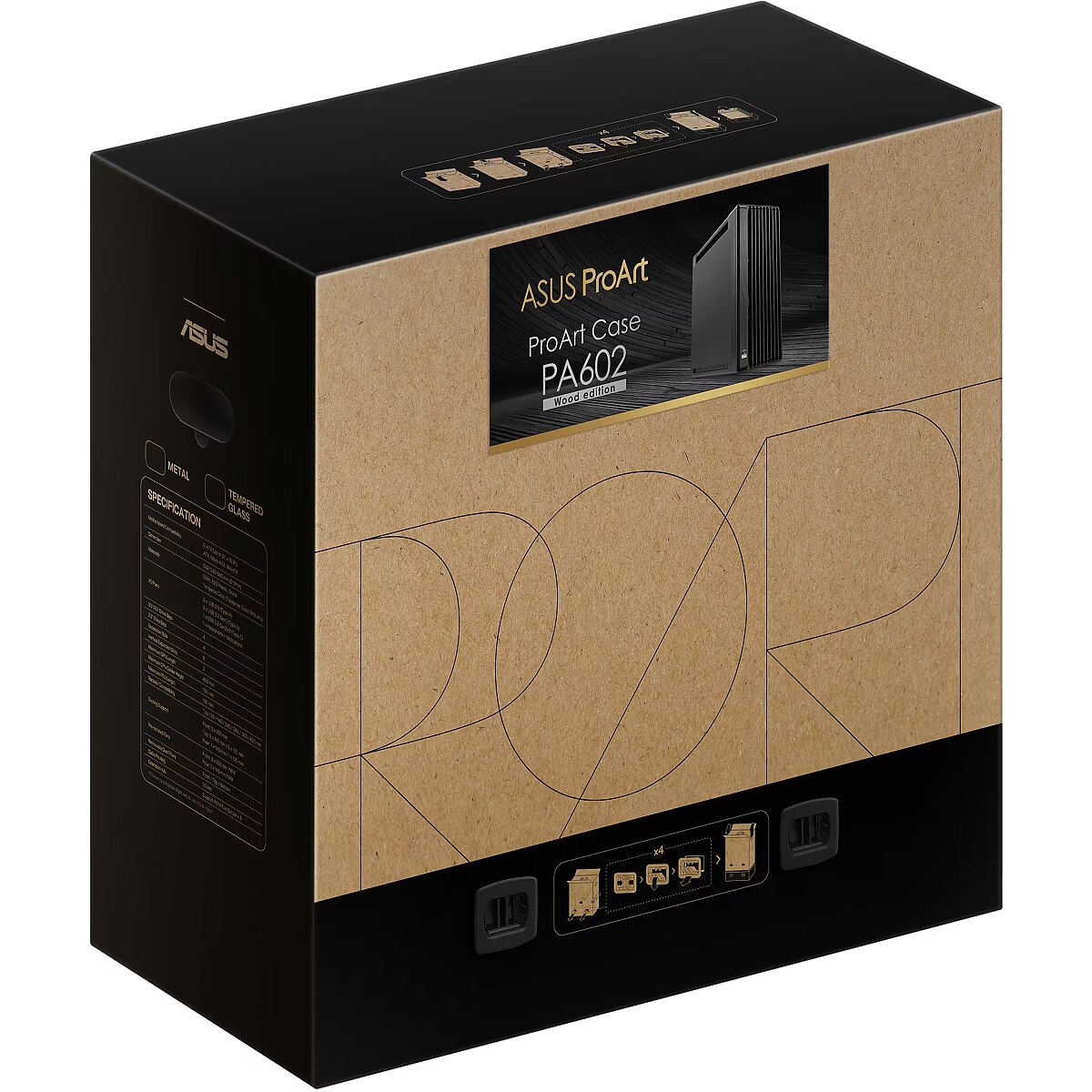 LongDesc - Superb Cooling, Timeless DesignThe ProArt PA602 Wood Edition showcases a crafted wooden design, embodying your unique style while promoting sustainable elegance with environmental certification from the Forest Stewardship Council® (FSC®). A six-stage process integrates durable and beautiful thermowood with optimal airflow and enhanced cooling, to inspire creative professionals seeking focused workflows. With a front panel designed for maximum air intake, a thick pre-installed 140 mm rear fan and two 200 mm front fans, an integrated fan hub and support for a 420 mm radiator, it delivers top-tier performance right out of the box.Naturally CraftedAsh wood, an uncommon choice for this style of case, is specially selected for its high durability. Our special six-stage design process begins with thermowood treatment to protect this premium material from insects, humidity and heat. Then it is shaped and grinded, refining each piece to our exact specifications. Finally, a two-step coating elevates its unique coloration with a glossy finish. The ProArt PA602 Wood Edition offers a distinctive look that elevates personal style while supporting eco-friendly practices. The ash wood used in this case is certified by the FSC®, making it an excellent choice for style-conscious tech enthusiasts who value sustainability.COOLINGAir SuperiorityThe PA602 Wood Edition features an open front grill with high porosity to maximize airflow and ventilation. Meanwhile, extra-thick PWM fans yield very high airflow and pleasant acoustics, and pre-installed dual air deflectors work in concert to help centralize cool air for both graphics cards and CPU cooler air intake, enhancing cooling efficiency for the whole system.Two Choices for your PreferenceTo cater to a variety of DIY builders, the PA602 Wood Edition is offered in two versions. The metal side panel version prioritizes cooling efficiency and durability, while the version with a tempered glass side panel offers more aesthetic appeal and the opportunity to display the personalized inner workings of your PC.Ample SpaceSpace for Powerful ComponentsThe ProArt PA602 Wood Edition supports one 420 mm radiator for AIO cooling or custom liquid-cooling loops. It also provides sufficient space for the beefiest graphics cards in both horizontal and vertical mounting positions.DesignCreator-friendly DesignThe ProArt PA602 Wood Edition streamlines your PC building experience with a full suite of innovative features, and it’s primed for convenient everyday use with automatic dust detection, built-In wheels for effortless moving and more.ConnectivityFront I/O Optimized for CreatorsThoughtful touches streamline the day-to-day experience for artists and designers.Premium Fan Speed ControlWith integrated PWM control, switching between normal and working scenarios is effortless.20Gbps USB Type-C®The PA602 Wood Edition incorporates one 20Gbps USB Type-C port alongside two USB 3.0 and two USB 2.0 ports, for future-proof and backward-compatible connectivity with compatible motherboards.Power Lock LatchThe power button is intelligently designed with a physical latch to prevent accidental presses during your work session, to help provide a hassle-free experience.ExpandabilitySuperior Storage ExpandabilityThis chassis supports up to four HDDs or up to eight SATA SSDs, ensuring ample storage capacity for your data storage needs.