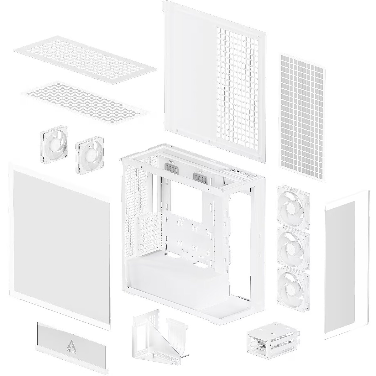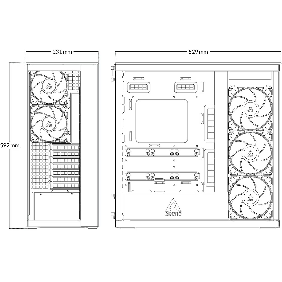 Summary - ARCTIC Xtender VG (White) Premium E-ATX PC Case with Vertical GPU Mounting. Form factor: Midi Tower, Type: PC, Product colour: White. Power supply location: Bottom, Supported power supply form factors: ATX. Side fans installed: 3x 140 mm, Side fans diameters supported: 120,140 mm, Rear fans installed: 2x 120 mm. Supported HDD sizes: 2.5,3.5". Width: 231 mm, Depth: 529 mm, Height: 529 mm