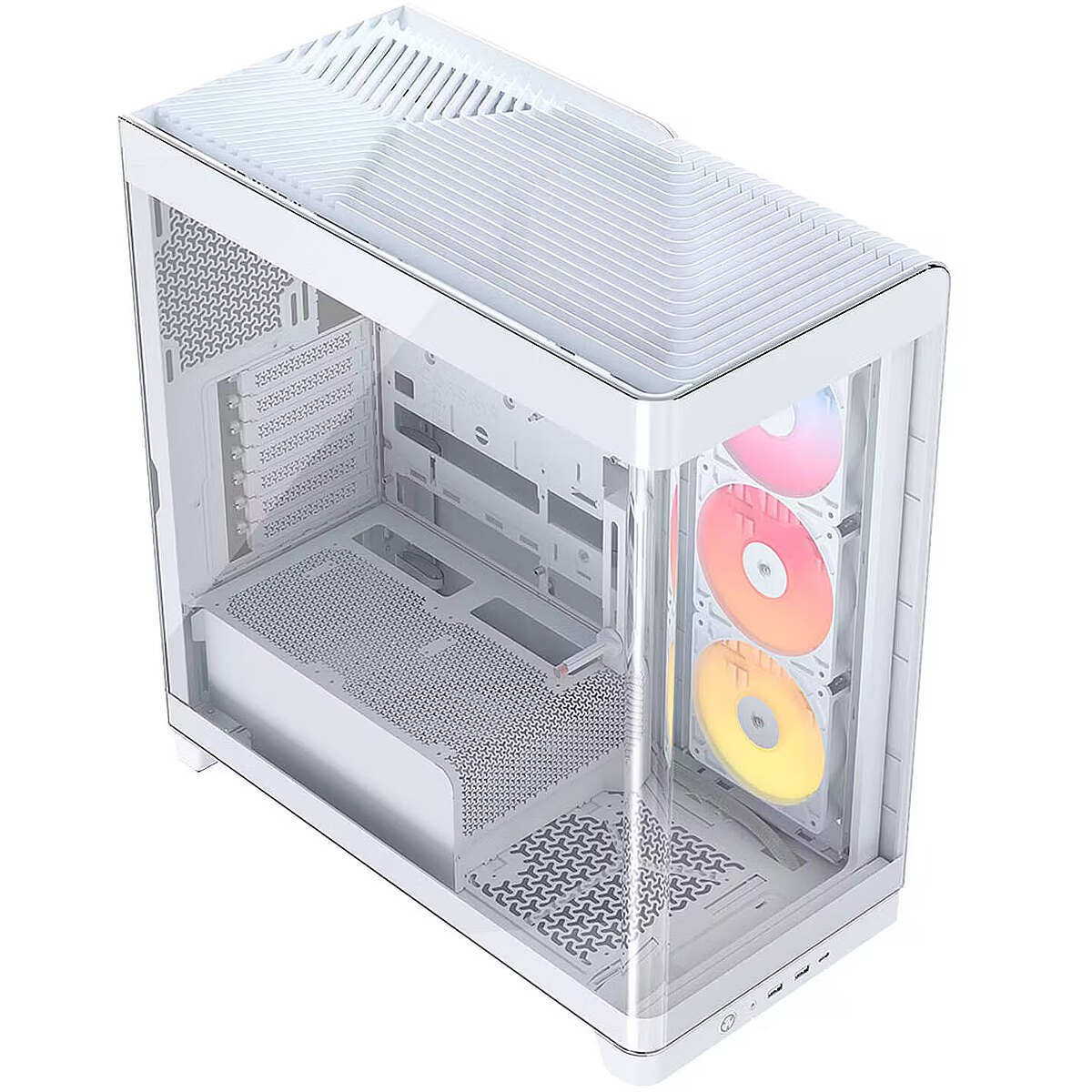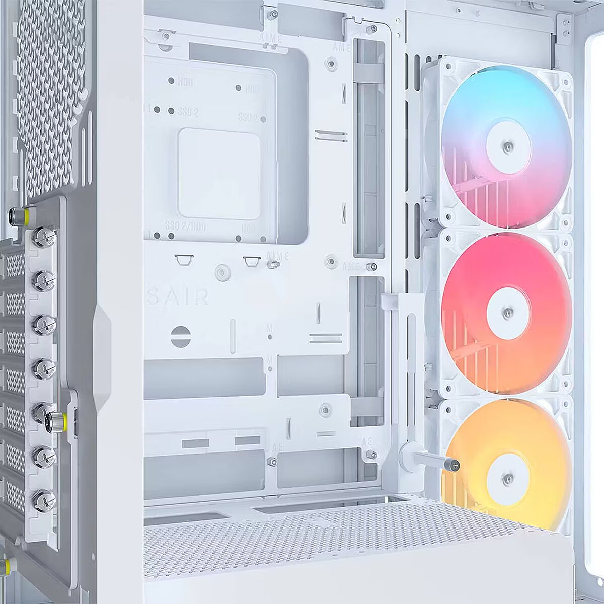 Wentylatory wlotowe ARGB PWM RS-R z odwróconym wirnikiem zapewniają niezakłócone oświetlenie RGB i ciche chłodzenie. Świeże powietrze jest wciągane przez wentylowany bok do przestronnej obudowy mid-tower, zapewniając efektywne chłodzenie i duży przepływ powietrza w celu zapewnienia maksymalnej wydajności. WENTYLOWANE PANELE BOCZNE I GÓRNY