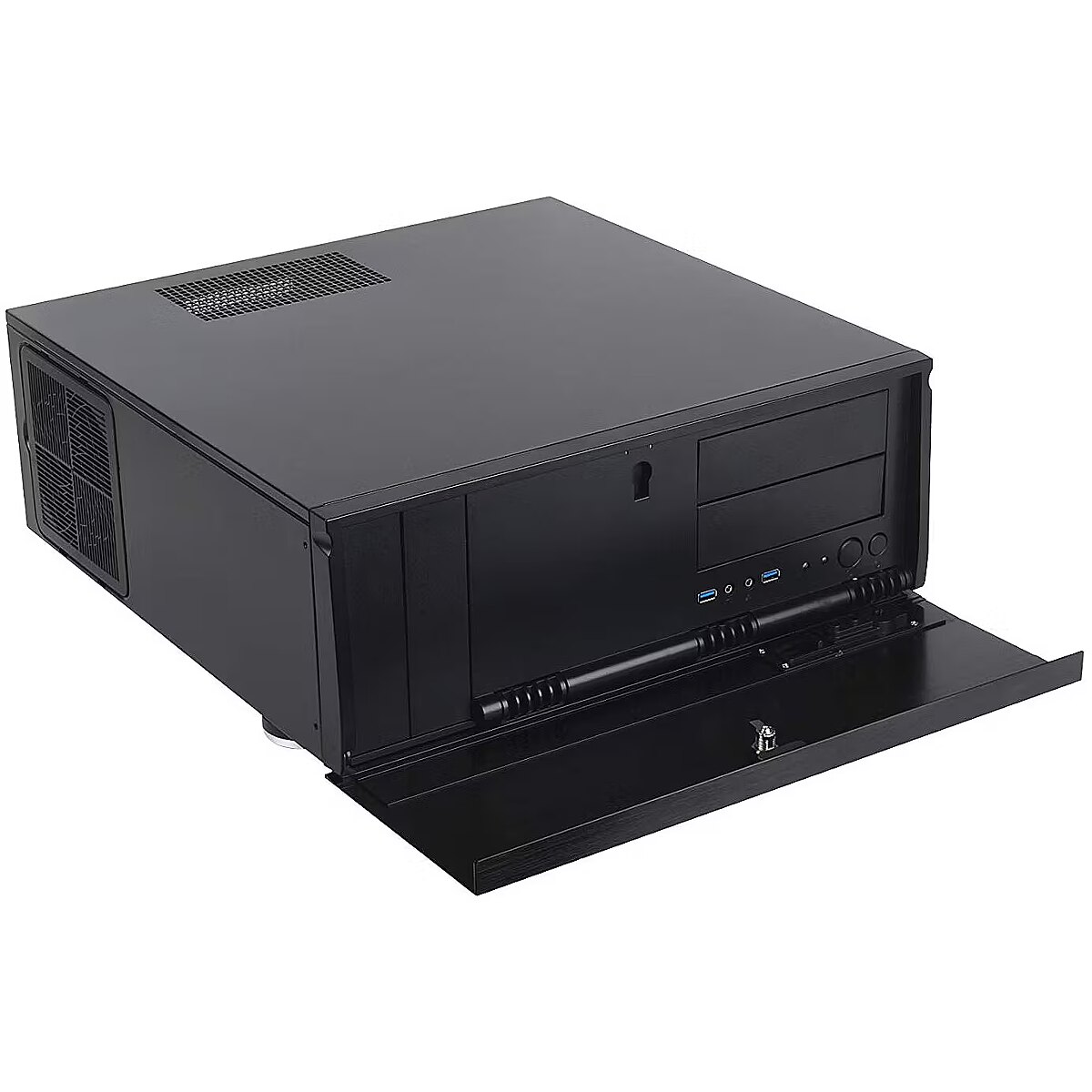 - Impressive storage capacity of up to eleven drive bays Format E-ATX Maximum CPU-Cooler Height 138 mm Special Featuress USB 3.0; ein 120-mm-Fan (18 dBA) im Seitenteil included, ein weiterer 120-mm-Fan einbaubar; Luftöffnungen an der Oberseite; two 120-mm-Fan (18 dBA) im chassisboden included; abschließbare Aluminium-Frontklappe; Überdruckdesign zur ausgezeichneten cooling; schnell zugängliche Filter verhindern Staubablagerung; LED-Anzeige with einstellbarer Helligkeit Power Supply Slot Design ATX Drive Bays external 5,25 inches 4 internal 3,5 inches 5 2,5 inches 2 Fans Included 3x 120 mm Installable 1x 120 mm Front-Side Special Featuress Power-button Ports USB 3.0 2 Audio 2 Back-Side Slots Full-Size 7 additional Full-Size 1 Product dimensions 440 x 175 x 435 mm Weight 7 kg