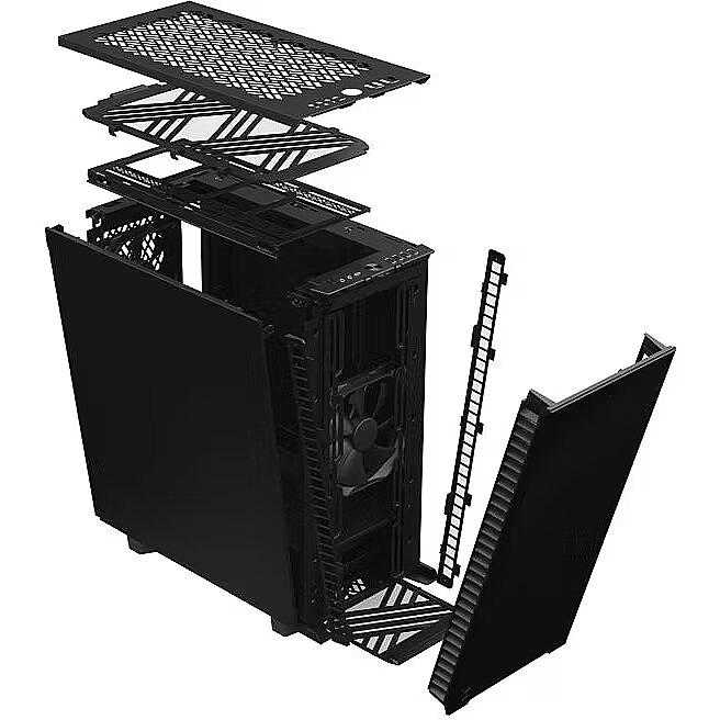Description - Compact yet spacious The versatile layout of the Define 7 Compact allows you to maximize the potential of the small footprint with full-size ATX hardware to meet your exact needs. For example, you can easily fit GPUs up to 360 mm with a 240 mm radiator in the top or up to 360/280 mm front radiators with GPUs under 305 mm. Remarkably quiet Solid construction with industrial high-density sound damping helps maintain whisper-quiet operation Brushed aluminum front and top-latching side panels offer a clean sophisticated look Top panel effortlessly swaps from solid steel to filtered ventilation Substantial cooling Install up to 7x 120 mm or 4x 140 mm fans, and radiators up to 360 mm 1x 120 mm and 1x 140 mm Dynamic X2 fans included Ventilated PSU shroud with two-part removable cover for optimal coverage and front radiator support