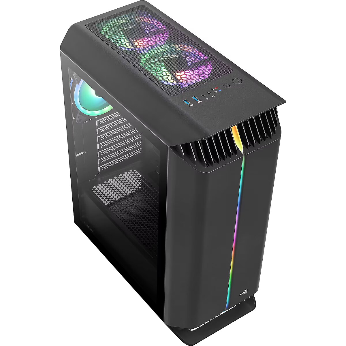 LongDesc - High-performance mid tower case with a full tempered glass side panel to showcase the inside of your rig. Bring your case to life with a stylish ARGB design in the front panel of the case. Supports liquid cooling in the front, top, and rear of the case for maximum efficiency cooling. Comes equipped with two 12cm ARGB fans in the top and one 12cm ARGB fan in the rear of the case.Addressable RGB fans can be controlled using one of two ways: RGB LED control button or Addressable RGB motherboard. Includes a 6-Port ARGB control hub to connect and control your ARGB fans.THREE 12CM ADDRESSABLE RGB FANS INCLUDEDComes equipped with two 12cm ARGB fans in the top and one 12cm ARGB fan in the rear of the case.Duo 12 FansFeaturing Double RGB LED rings around the fan and circling the center, the Duo 12 ARGB fan delivers a stylish and vibrant lighting experience while keeping your system cool.ADDRESSABLE RGB COMPATIBLEControl your Addressable RGB using compatible ARGB motherboards including ASUS Aura Sync, MSI Mystic Light Sync, and Gigabyte RGB Fusion (with 5V 3-Pin ARGB header).Addressable RGB can be controlled using any of two ways:LED control button or ARGB motherboard.6-PORT RGB CONTROL HUBFeatures a 6-port hub with PWM control functions and allows you to connect up to six 6-Pin AeroCool Addressable RGB fans and up to two 3-Pin Addressable RGB accessories with +5V ARGB connector.Access 16.8 million colors using compatible Addressable RGB motherboard (Asus Aura Sync, MSI Mystic Light Sync, and Gigabyte RGB Fusion).PWM COMPATIBILITYPlease check if the 4-Pin fan header on your motherboard is PWM compatible.- PWM based – PWM compatible- Voltage based – not PWM compatibleFor more information, refer to our PWM Compatibility Guide.IMPROVED AIR VENTILATIONAir vents in the front panel increase air flow and ventilation to keep your system cool.FULL TEMPERED GLASS SIDE PANELComes equipped with a full tempered glass side panel to showcase the inside of your rig and put your components on display.AIR COOLINGSupports air cooling in the front, top, and rear of the case to enhance cooling performance.- Front: 120mm x 3 or 140mm x 2 (Max.)- Top: 120mm x 2 (12cm ARGB fan x 2 included)- Rear: 120mm x 1 (12cm ARGB fan x 1 included)- PSU Shroud: 120mm x 2 (Max.)LIQUID COOLINGSupports liquid cooling in the front, top, and rear of the case for maximum efficiency cooling.- Front: 120/240/360mm Radiator (Optional)- Top: 120/240mm Radiator (Optional)- Rear: 120mm Radiator (Optional)DUAL CHAMBER DESIGNBuilt with a dual chamber design to direct heat away from the main chamber for more effective all-around cooling.BUILT FOR HIGH PERFORMANCE- Supports ATX, Micro-ATX, and Mini-ITX motherboards- Supports CPU coolers up to 161mm- Supports graphics cards up to 326mmCONVENIENT ACCESS TO YOUR MEDIAQuick and easy access to 2 x USB 3.0, HD audio and mic ports, and power button.STORAGE CAPABILITYSupports up to:- 2 x 3.5” HDDs (1 x 3.5” and 1 x 3.5”/2.5″)- 3 x 2.5” SSDs (2 x 2.5” and 1 x 2.5”/3.5”) EASY MAINTENANCERemovable dust filters on the front, top, and bottom of the case for convenient cleaning and maintenance.