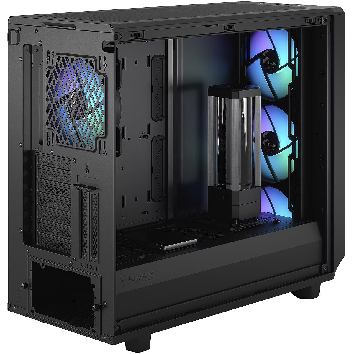 Technical_details - Meshify 2 RGB Black TG Light Tint, Tower Case The Meshify 2 RGB Black TG Light Tint PC case is a high-performance case with an equally elegant and expressive design. It features a screwless tempered glass side panel, a fully removable top panel for easy component installation, and a mesh front panel with USB-C port and removable dust filter. Thanks to the flexible dual layout of the interior, setups with numerous drives or multiple radiators for optimal cooling are equally possible. Type: Tower case Color: Black EAN: 7340172703662 Manufacturer No.: FD-C-MES2A-06 Design: midi tower Mainboard form factor: E-ATX Window Kit: Yes Internal dimensions: plug-in card length | maximum 450 mm Internal measurements: CPU cooler height | maximum 185 mm Internal dimensions: PSU form factor | ATX Internal dimensions: PSU length | maximum 250 mm Drive bays: 3.5 inch | internal | 6 pieces Drive bays: 2.5 inch | internal | 2 pieces Slots: Full Size | 7 pieces Slots: additional full-size | 2 pieces Front connectors: 1x audio, 2x USB-A 3.2 Gen 1 (5 Gbps), 1x USB-A 3.2 Gen 1 (10 Gbps) Front connectors: The designation USB 3.2 Gen 1 corresponds to the former designation USB 3.1 Gen 1 / USB 3.0. Front connectors: The designation USB 3.2 Gen 2 corresponds to the former designation USB 3.1 Gen 2 / USB 3.1. Front: 3x 140 mm Aspect 14 RGB fans available, alternatively 3x 120 mm fans can be installed Rear: 1x 140 mm Aspect 14 RGB fan available, alternatively 1x 120 mm fan can be installed Notes: 3x 140mm or 3x 120mm fans can be installed on the top, 2x 140mm or 2x 120mm fans can be installed on the bottom, top and bottom (mesh front) Water cooling possible: Yes Water cooling possible: Supported radiators | Front: up to 360/280 mm, top: up to 360 mm, back: up to 120 mm, bottom: up to 280 mm Dimensions: Width: 240mm x Height: 454mm x Depth: 541mm Weight: 11.1 kg