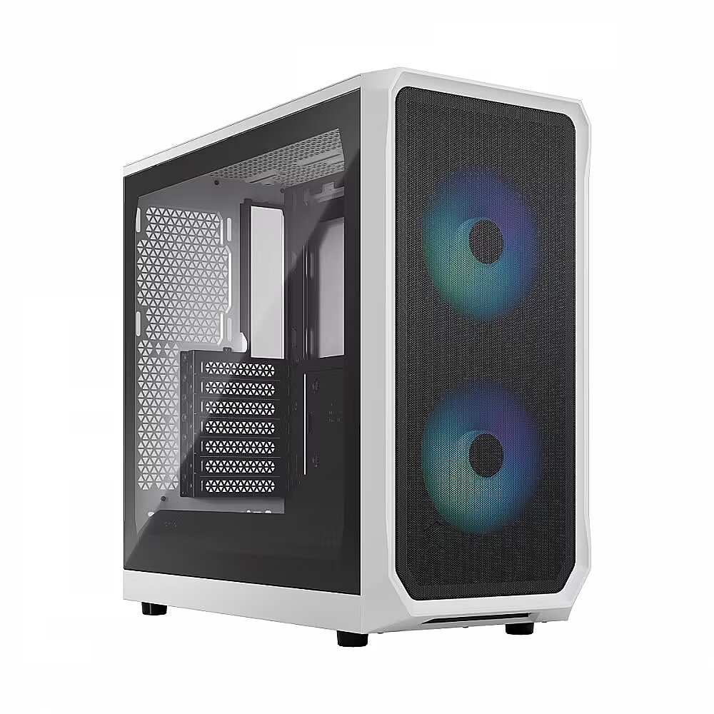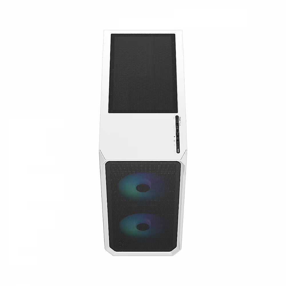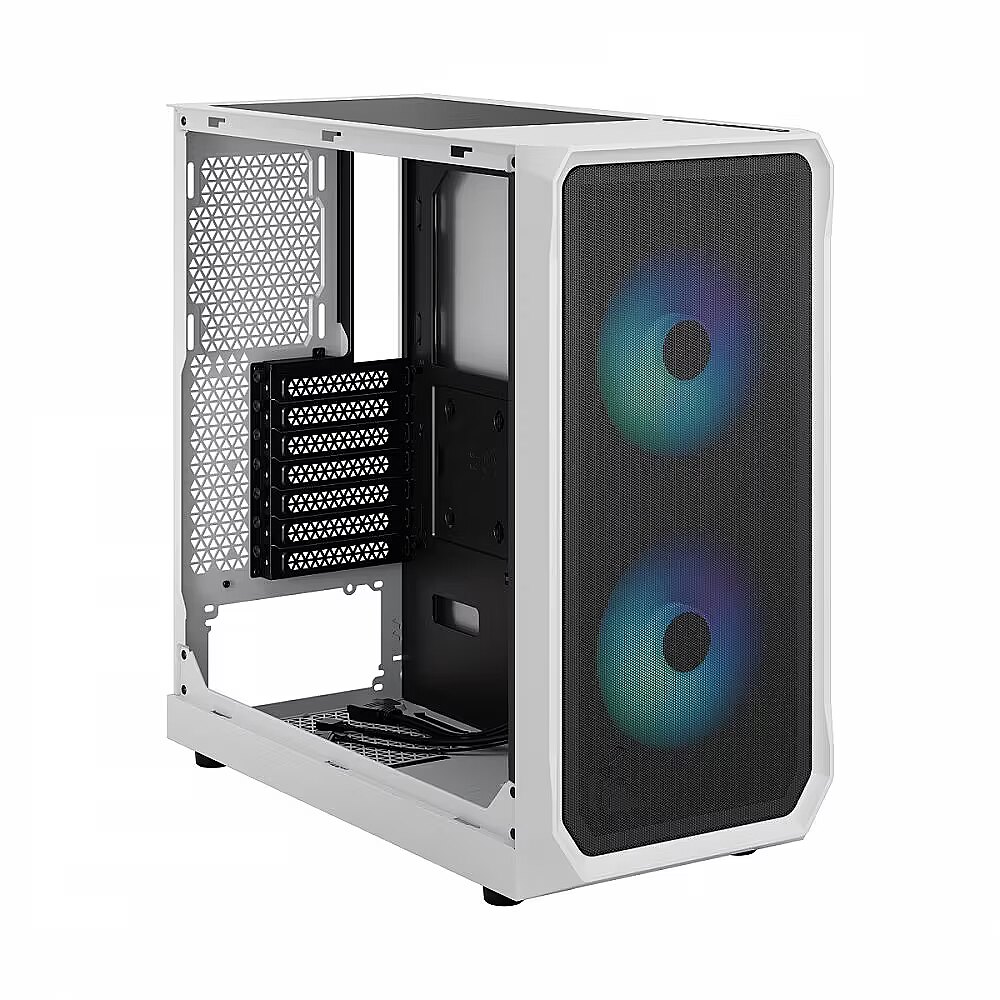 Technical_details - Type: Tower case Color white EAN: 7340172703488 Manufacturer No.: FD-C-FOC2A-04 Design: midi tower Motherboard form factor: ATX Window Kit: Yes Mesh Front: Yes Internal dimensions: maximum 405 mm : maximum 170mm : ATX : maximum 250mm Drive bays: 2 pieces : 2 pieces Slots: 7 pieces Front ports: 2x audio, 2x USB-A 3.2 Gen 1 (5 Gbps) : The designation USB 3.2 Gen 1 corresponds to the former designation USB 3.1 Gen 1 / USB 3.0. Front: 2x Aspect 14 RGB fans available, alternatively 3x 120 mm fans can be installed Rear: 1x 120 mm fan can be installed Notes: Easy-to-clean mesh dust filter on the front, RGB controller included, 2x 140 mm or 2x 120 mm fans can be installed on the top, dust filter: top (plastic mesh), PSU (nylon), space for cable management: 19mm Lighting: Yes, RGB Water cooling possible: Yes : Front: up to 360mm, Top: up to 240mm (max 46mm height of motherboard components), Rear: up to 120mm Dimensions: Width: 215mm x Height: 450.5mm x Depth: 471.5mm Weight: 6.4kg