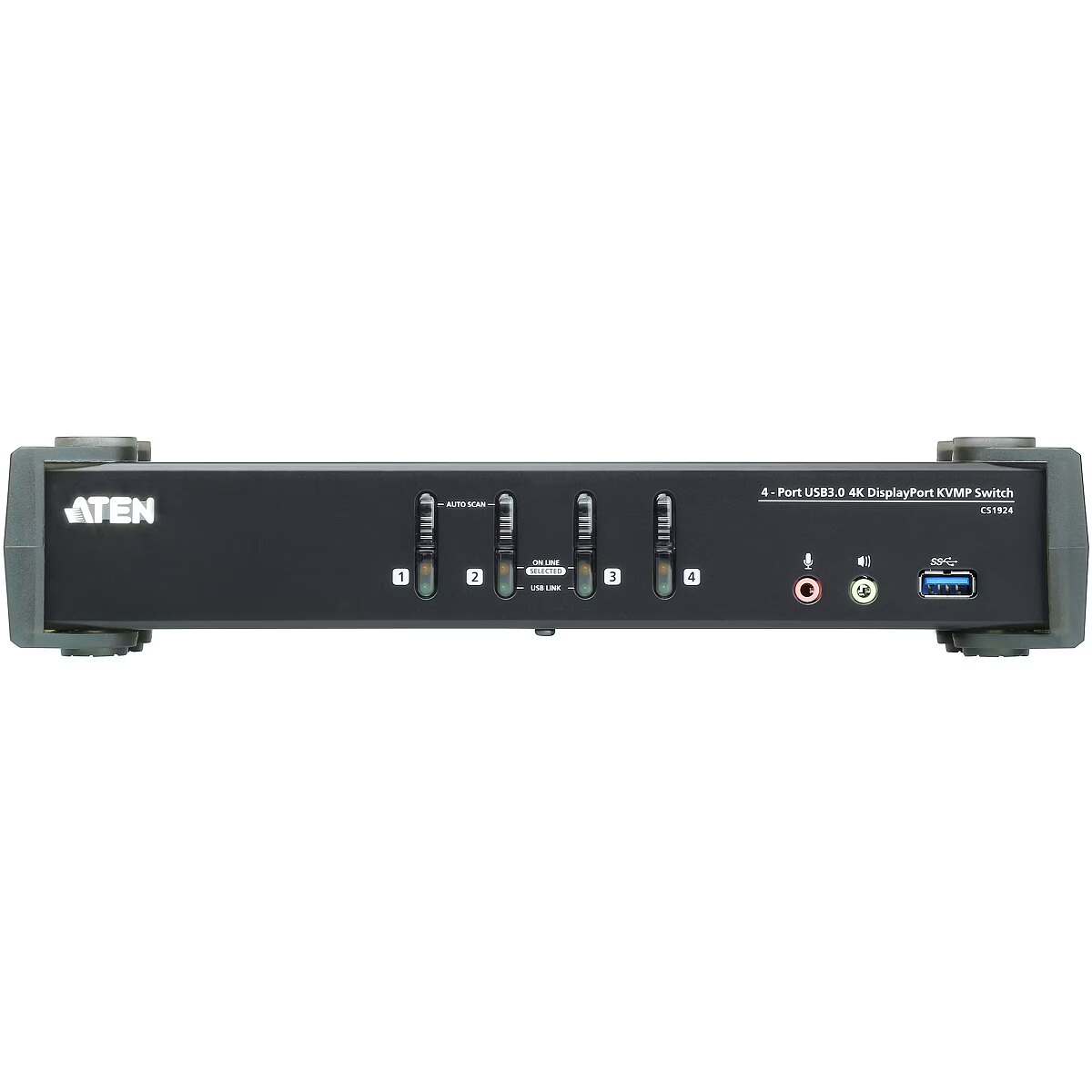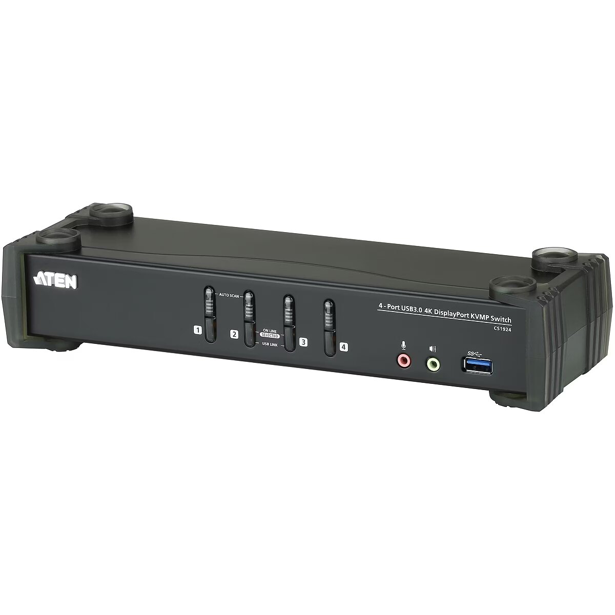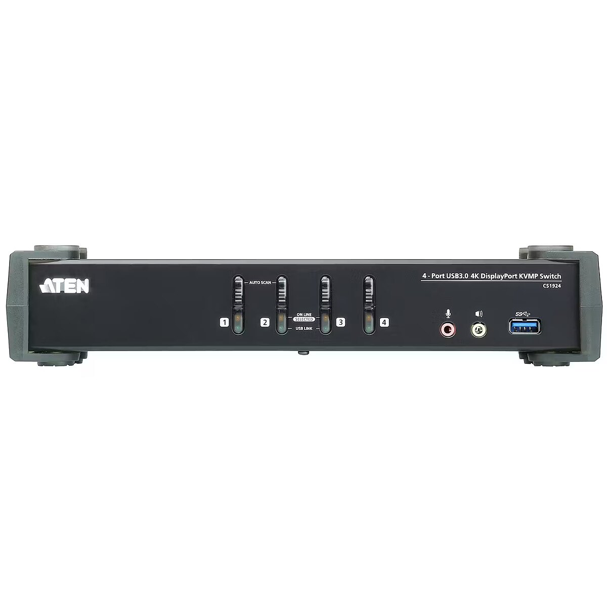 LongDesc - The ATEN CS1924 4-Port USB 3.0 4K DisplayPort KVMP™ Switch provides the latest innovations in desktop KVM switching technology for the increasing demand of higher video quality and transfer speeds on modern computers. The ATEN CS1924 offers an unprecedented performance of delivering 4K resolution, the next generation USB 3.1 Gen 1 hub with SuperSpeed 5 Gbps data transfer rates and enhanced user-friendly operations.As a KVM switch, the CS1924 allows users to access four DisplayPort computers from a single USB keyboard, USB mouse and monitor console. Doing so with ease, the CS1924 provides three convenient switching methods – using front panel pushbuttons, mouse, or hotkeys for flexible access to any computer connected to the installation. The unique independent switching feature allows the KVM control to focus on one computer while the USB peripheral focus is on another computer. This eliminates the need to purchase a separate USB hub or stand-alone peripheral sharer – such as a print server, modem splitter, etc. With its rich feature set, the CS1924 is designed to surpass all requirements in graphic design, animation, and video-editing applications. Such as CAD/CAM (computer aided design/manufacturing). The CS1924 allows you to share the audio from each of the connected computers. HD audio transmitted by DisplayPort would offer you a different experience.