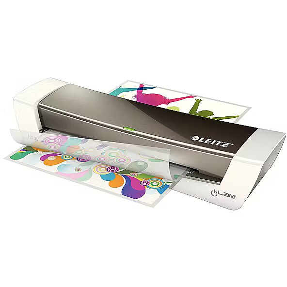 LongDesc - Stylish and compact, the Leitz iLAM Home Office laminating machine seamlessly blends modern design with functionality. Designed for convenience, this A4 laminator features a quick 2-minute warm-up time and can laminate an 80-micron A4 sheet in just 45 seconds. Its user-friendly rocker switch lets you select from three pouch thickness levels, ensuring versatile use for all your laminating needs. The anti-jam release lever guarantees smooth operation by effortlessly resolving any misfed or jammed pouches. The innovative smart status LED enhances ease of use with intuitive lights and sounds: red during warm-up, green with an audible alert when ready, and flashing red for auto shut-off after 15 minutes of inactivity. Protect your documents quickly, efficiently, and in style. Silver and white colour.