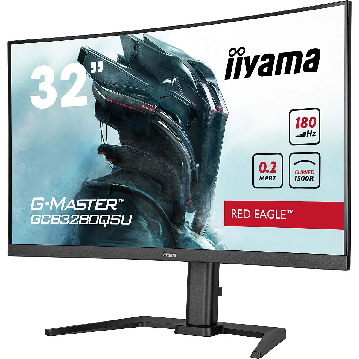 LongSummaryDescription - iiyama G-MASTER Immerse yourself in the game with the curved GCB3280QSU Red Eagle with 180Hz refresh rate. Display diagonal: 80 cm (31.5"), Display resolution: 2560 x 1440 pixels, HD type: Dual QHD, Display technology: LED, Display surface: Matt, Response time: 0.2 ms, Native aspect ratio: 16:9, Viewing angle, horizontal: 178°, Viewing angle, vertical: 178°. Built-in speaker(s). Built-in USB hub, USB hub version: 3.2 Gen 1 (3.1 Gen 1). VESA mounting, Height adjustment. Product colour: Black