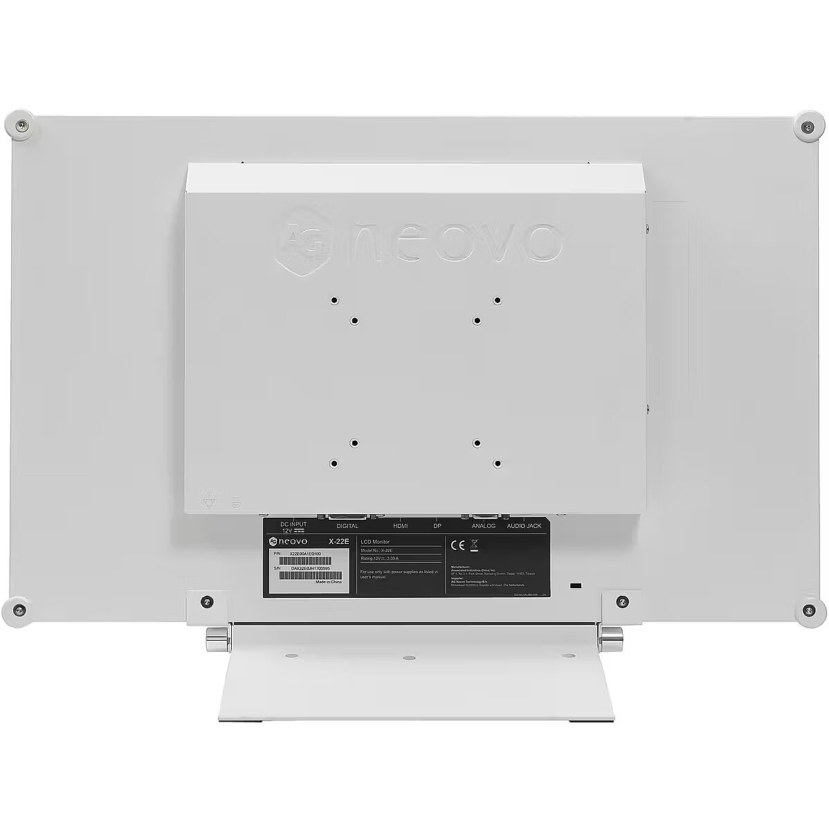 LongDesc - The X-22E semi-industrial monitor with the metal casing is designed for reliable 24/7 operation in demanding environments. With selectable gamma curves and versatile connectivity, this monitor provides an optimal visual experience with excellent colour, brightness, and contrast ratio. NeoV Optical Glass screen and corrosion-resistant metal casing shield it from scratches and chemical exposure which make it ideal for public, laboratory, and light industrial applications.The NeoV Optical Glass attached to the X-22E screen is scratch-resistant with anti-acid and anti-alkali coating treatment and tough enough to withstand repeated cleaning.DURABLE IN LIGHT INDUSTRIAL ENVIRONMENTIts corrosion-resistant metal casing provides enhanced heat dissipation, making the X-22E semi-industrial monitor durable for demanding environments.VERSATILITY, PRODUCTIVITY AND COMPATIBILITYThe X-22E allows viewing critical data and engaging multiple video sources with versatile connectivity, including DisplayPort, HDMI, DVI, and VGA. The PIP/PBP option allows for increased productivity and efficiency. Selectable aspect ratio and zoom functions provide compatibility with different video sources.PATENTED ANTI-BURN-IN TECHNOLOGYAG Neovo’s patented Anti-Burn-in technology tackles the LCD monitor burn-in effect, otherwise known as a ghost image on the screen. Burn-in images result in the polarisation of the liquid crystal material contained within the TFT LCD panel. The Anti-Burn-in technology prolongs the lifetime of AG Neovo monitors featuring this technology to secure user’s investment.CONSISTENT DESIGN WITH A LONGER LIFETIMEReplacing AG Neovo semi-industrial monitors never requires users to change their whole infrastructure. This is because AG Neovo offers a consistent form factor and long product life cycles. Even as technology advances, no change is made to exterior dimensions or design.ENHANCED GAMMA CORRECTIONSelectable gamma curves visually optimise different kinds of images. The AG Neovo specialised image settings enhance colour, brightness, sharpness and contrast ratio, allowing the X-22E semi-industrial monitor with a metal casing to improve the light, shadows and colour balance of videos.