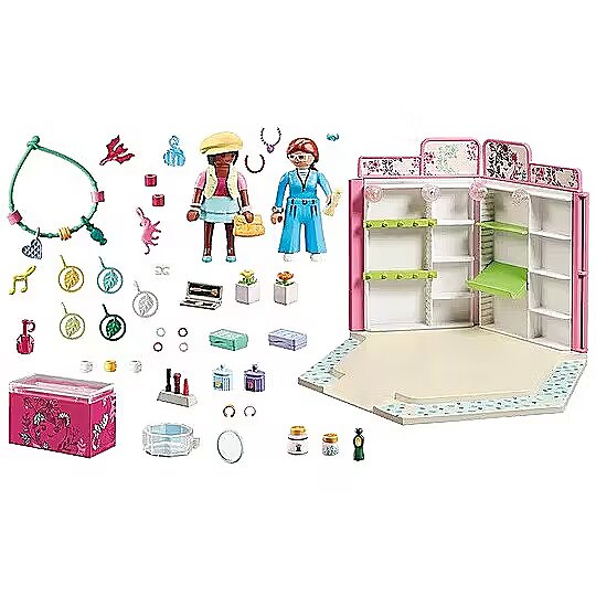 Accessories included - Figurki: 2 x Kobieta Podstawa 2 x Ściana boczna z półką 2 x Wspornik dachu Gablota sprzedażowa 4 x Małe pudełko Pudełko Pudełko do przenoszenia 2 x Pojemnik 2 x Pudełko do układania w stos z pokrywką Lustro okrągłe Kopertówka 2 x Pokrywka ze szkłem 2 x Roślina w doniczce 4 x Lampion 3 x Bransoletka 2 x Butelka kosmetyczna Flakon 3 x Tulipan 20 x Klejnot 20 x Płatek 2 x Przypinany motyl 2 x Przypinana gwiazda 2 x Przypinane serce Naszyjnik 3 x Pasek do zegarków na rękę 2 x Szpilka kwadratowa 3 x Szpilka okrągła Probówka stojąca Pędzel do pudru Szminka Tusz do rzęs Flakon Naszyjnik z kamyczkami