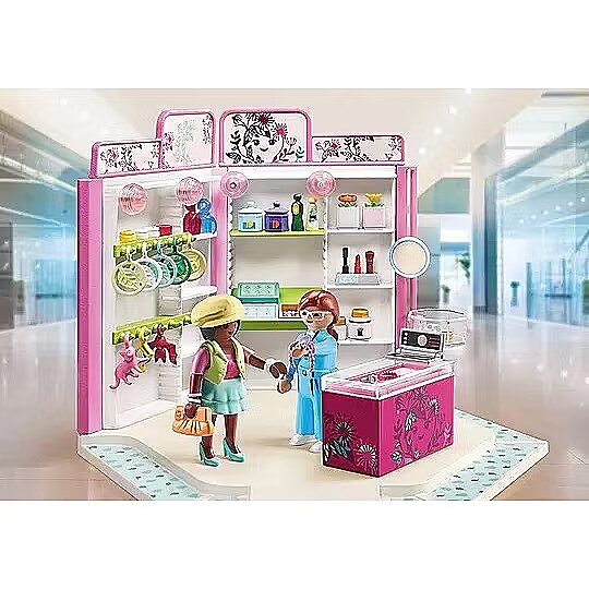 Szczegóły produktu: Uroczo zaprojektowany salon piękności z dwiema figurkami PLAYMOBIL, gablotą sprzedażową, pudełkami, bransoletkami, gwiazdkami, szminką i wieloma innymi przyborami do makijażu i biżuterią. Dołączoną silikonową bransoletkę dla dzieci można ozdobić różnymi zawieszkami i koralikami. Wszystkie zestawy z serii PLAYMOBIL My Life Shopping można łączyć ze sobą i tworzyć z nich wielki świat zakupowego szaleństwa.