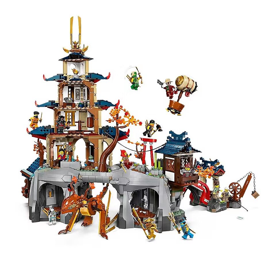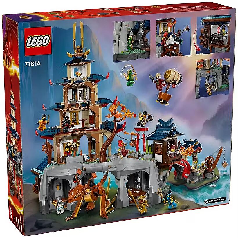Description - Boys and girls aged 14+ can build, play with and proudly display the Tournament Temple City (71814) adventure toy set from season 2 of the NINJAGO Dragons Rising TV show. This spectacular and detailed fantasy toy battle set for kids makes an impressive display model and contains lots of interactive features and functions for hours of action-packed playtime. The NINJAGO temple built into a rock face features a 4-tiered pagoda, a bridge, a water mill kids can turn to move 2 battle platforms and a blacksmiths hammer, plus falling rocks that are activated by pressing a lantern, hidden storage and a secret door. Kids can turn the temple around, where its open back provides extra play options and the chance to create fun little stories. This buildable ninja toy for kids comes with 13 NINJAGO minifigures: Lloyd, Cole, Nya, Zane, Arin, Wyldfyre, Lord Ras, Jordana, Mr. Pale, Blacksmith, a Temple Guard, Roby and Bleckt. There is also an airship and a posable dragon toy with blade-style wings. NINJAGO temple adventure toy for kids Boys and girls aged 14+ can build, play with and proudly display this Tournament Temple City building set from season 2 of the NINJAGO Dragons Rising TV show Playable ninja display model Includes a water mill that can be turned to move 2 battle platforms, a blacksmiths hammer and falling rocks that are activated by pressing a lantern Posable dragon toy and airship This action toy for kids also includes a posable dragon toy and an airship for theNINJAGO minifigure characters to travel in 13 NINJAGO minifigures This ninja toy for kids comes with Lloyd, Cole, Nya, Zane, Arin, Wyldfyre, Lord Ras, Jordana, Mr. Pale, Blacksmith, a Temple Guard, Roby and Bleckt for role play LEGO NINJAGO gift for play and display This ninja LEGO set for kids provides a fun build-and-play experience and is a birthday gift idea for boys and girls aged 14 and up A helping hand Discover intuitive instructions in the LEGO Builder app, where builderscan zoom in and rotate models in 3D, track their progress and save sets as they develop new skills Bigger ninja adventures Look out for more LEGO NINJAGO toys (sets sold separately) featuring dragons, mechs and vehicles Measurements This big LEGO set has 3,489 pieces and includes Temple Island measuring over 19 in. (48 cm) high, 25 in. (63 cm) wide and 12.5 in. (32 cm) deep