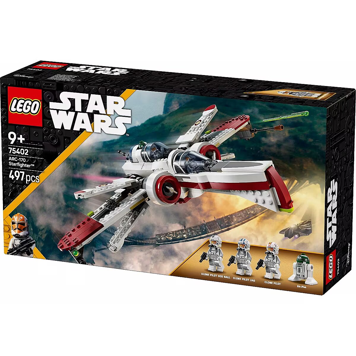 Description - Recreate Star Wars: Revenge of the Sith missions with this ARC-170 Starfighter building toy (75402) for kids. A top LEGO Star Wars gift idea for boys, girls and fans aged 9 and up, the brick-built starfighter features 3 opening cockpits, 6 wings, including 4 lever-operated adjustable wings for attack and cruise modes, and 2 spring-loaded shooters. The buildable starship playset includes 4 LEGO Star Wars characters. The Clone Pilot Odd Ball, Clone Pilot Jag and Clone Pilot LEGO minifigures can be placed in the cockpits, and there is also space on board for the R4-P44 LEGO droid figure. Enhance kids creative experience with the LEGO Builder app, where they can zoom in and rotate a digital 3D version of this Star Wars starfighter as they build. The vehicle and characters in this set can be used with other LEGO Star Wars collectible building toys (sold separately) to open up extra fantasy play possibilities. Star Wars starfighter building toy for kids Play out epic Star Wars: Revenge of the Sith stories with this detailed LEGO brick-built model of an ARC-170 Starfighter 4 LEGOStar Wars characters Clone Pilot Odd Ball, Clone Pilot Jag and Clone Pilot LEGO Star Wars minifigures, each with blaster pistols, plus an R4-P44 LEGO droid figure LEGO brick-built starfighter Features 3 opening cockpits, a space for R4-P44, 6 wings, including 4 lever-operated adjustable wings for attack and cruise modes, and 2 spring-loaded shooters Star Wars buildable playset The Clone Pilot Odd Ball, Clone Pilot Jag and Clone Pilot LEGO minifigures each have blaster pistols for fantasy action play Star Wars gift idea for kids aged 9 and up Gift this high-quality buildable starship playset to creative boys, girls and any fans of Star Wars: Revenge of the Sith A fun way to build Let the LEGO Builder app guide kids on an intuitive building adventure, where they can rotate a 3D digital version of their construction models as they build, and more Collectible building toys for all ages LEGO Star Wars sets (sold separately) enable kids and adult Star Wars fans to relive iconic scenes, create new stories or simply display the buildable models Dimensions The LEGO Star Wars vehicle in this 497-piece building kit for kids measures over 3 in. (8 cm) high, 11.5 in. (29 cm) long and 14 in. (36 cm) wide