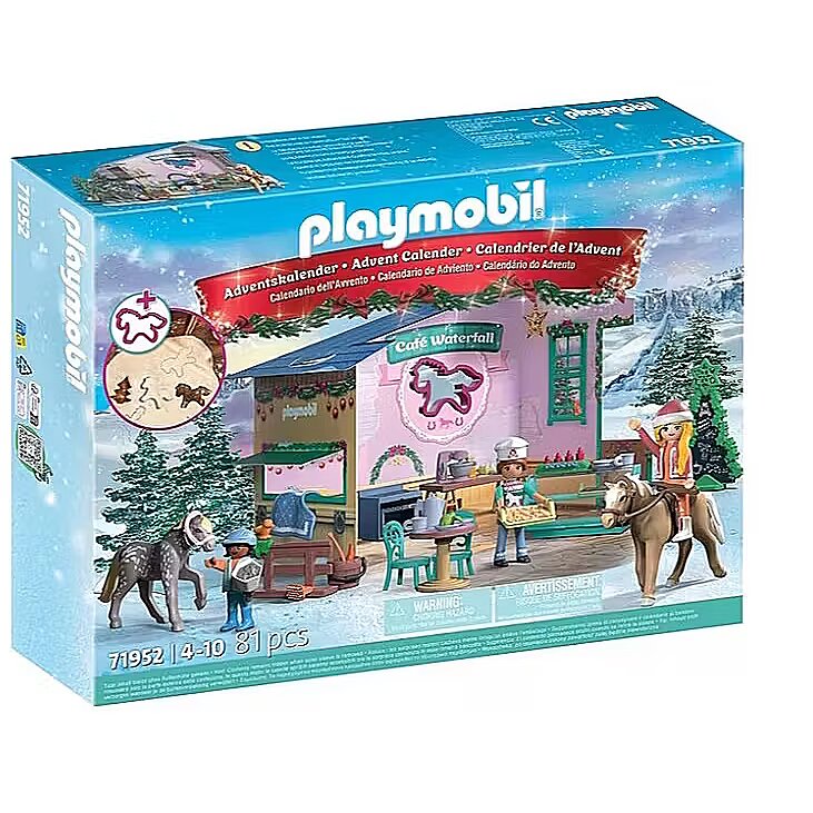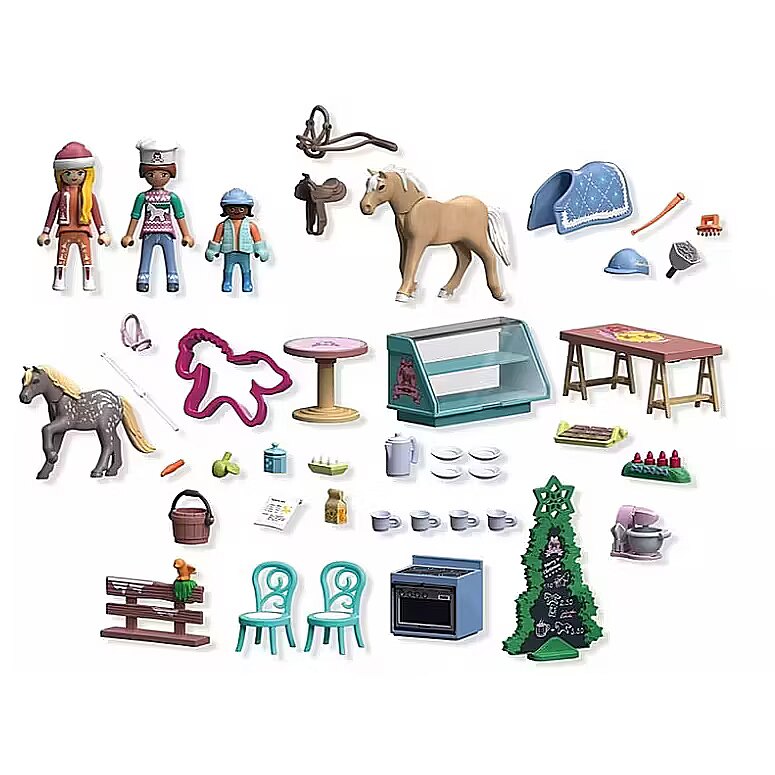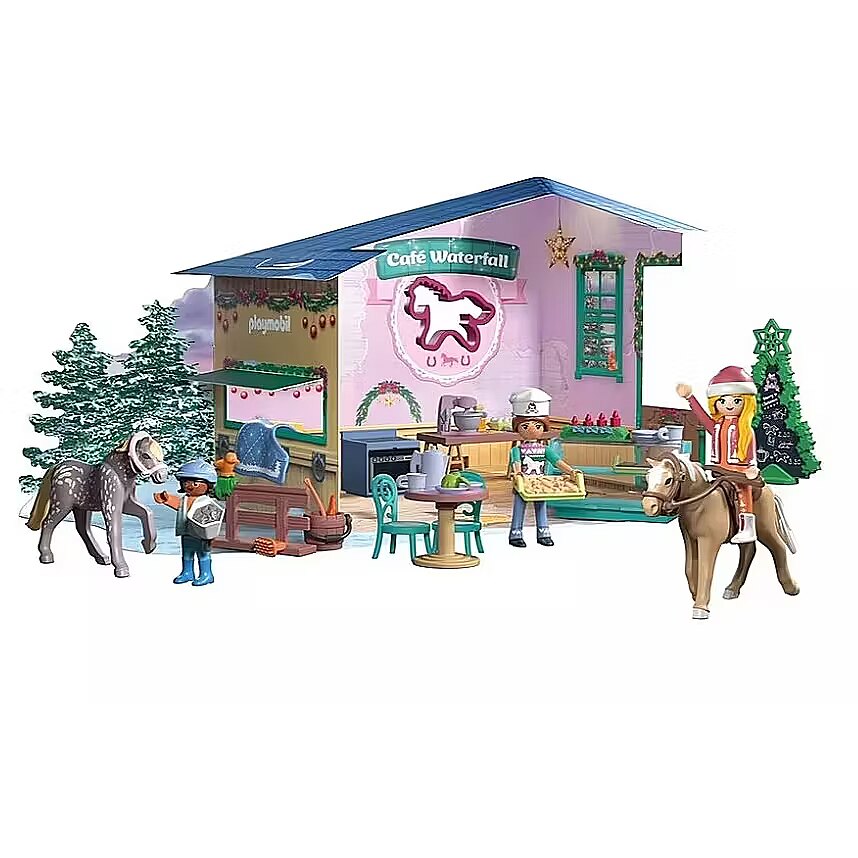 Apraksts - Ziemassvētki ūdenskritumā strauji tuvojas. Mmmmh - Ellijas omulīgajā kafejnīcā virmo debešķīga cepumu un punša smarža. Konīšiem jau ir sagatavoti gardumi. Turklāt, pateicoties atjautīgajai zirga formas cepumu veidnei, cepumus var izcept arī mājās. Ellijas Ziemassvētku kafejnīcā Ziemassvētku burvība satiekas ar lauku dzīves šarmu. Bērni var palīdzēt cept sezonālos gardumus, izmantojot burvīgo zirga formas veidni - lieliski piemērots kopīgām rotaļām mājas virtuvē. Krāsns atveras, lai varētu cept piparkūkas vai cepumus un pasniegt tos ar Ziemassvētku noskaņu. Izrotājiet kafejnīcu, paceliet stikla vitrīnu un izkārtojiet cepumus uz letes pēc saviem ieskatiem. Šis PLAYMOBIL komplekts ar dzīvniekiem, svētku aksesuāriem un ģimenes siltumu garantē nebeidzamu radošu izklaidi. Ideāli piemērots jebkuram svētku piedzīvojumam!