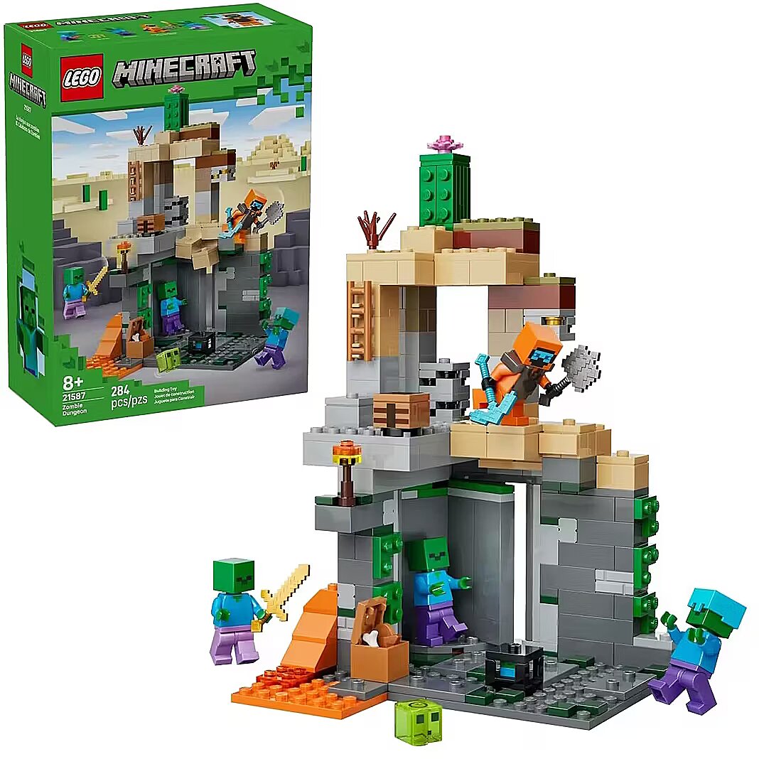 Description - Blocks Minecraft 21587 Zombie Dungeon Face off against a horde of zombies from Minecraft with the LEGO Minecraft Zombie Dungeon (21587) building set for boys and girls aged eight and up. Kids venture into a dungeon full of zombies, Minecraft characters, authentic game elements, and exciting accessories. The action takes place in a Minecraft desert biome, starring the Desert Wanderer equipped with a diamond pickaxe, a club, and Netherite armor, along with a slime and three zombiesone with enchanted leggings and a golden sword, and another with a diamond helmet. Fun features include a rotating chamber that spawns zombies and a sliding element that triggers falling rocks. Other imaginative accessories include a crafting table, a torch, and a chest containing bread, a bone, and rotten flesh. This set makes a great gift for Minecraft players and LEGO fans. With the LEGO Builder app, kids can build with confidence, zoom in, rotate models in 3D, and track their progress using simple digital instructions. The set consists of 284 pieces.