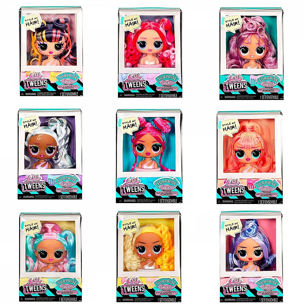 Description - L.O.L. Surprise Tweens Surprise Swap styling head Have fun designing and styling with the all-new L.O.L. Surprise Tweens Surprise Swap styling heads! Each head comes with a unique hairstyle and a variety of styling accessories, including adorable hair clips and combs for endless metamorphoses! Change the look and create one-of-a-kind braids, buns, and many more hairstyles! Combine the styling heads with the fantastic new Tweens Surprise Swap Fashion Dolls, swapping heads with your fashion doll. Repeat the changes, create endless combinations and matches! The styling heads can be placed back on the racks for easy cleaning and styling. Collect all 9 gorgeous styling heads. Various designs. No choice of specific model available. Price per display containing 12 pieces.