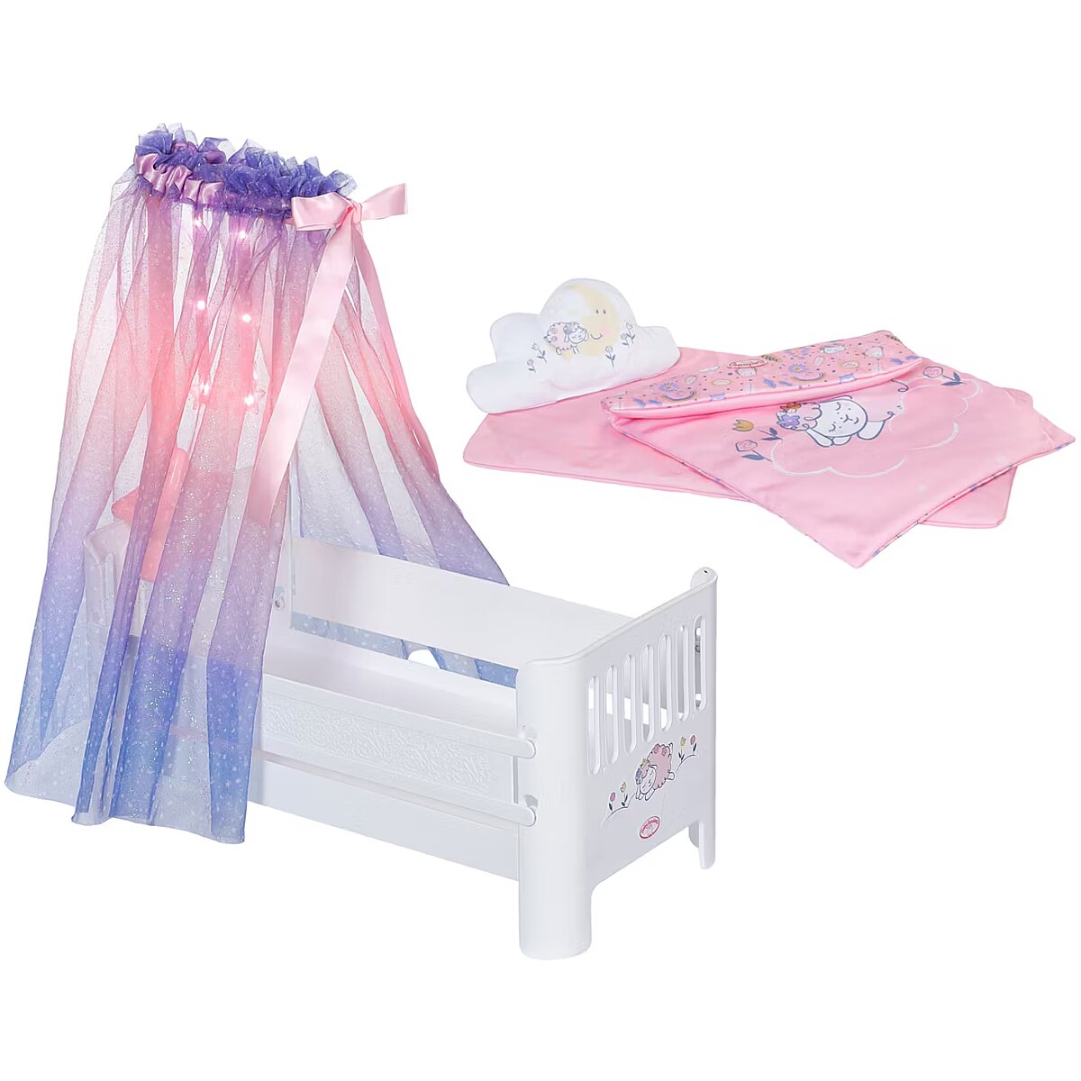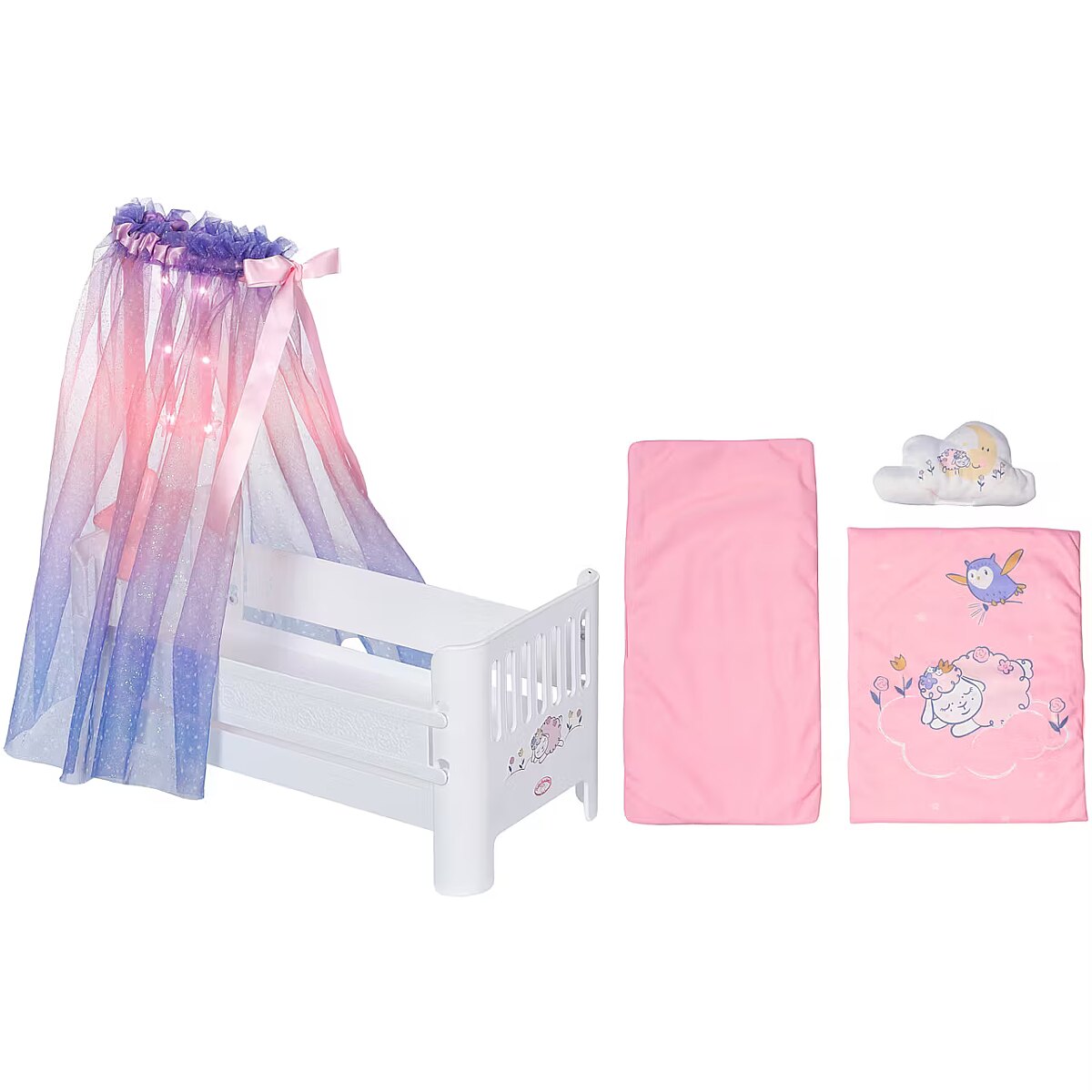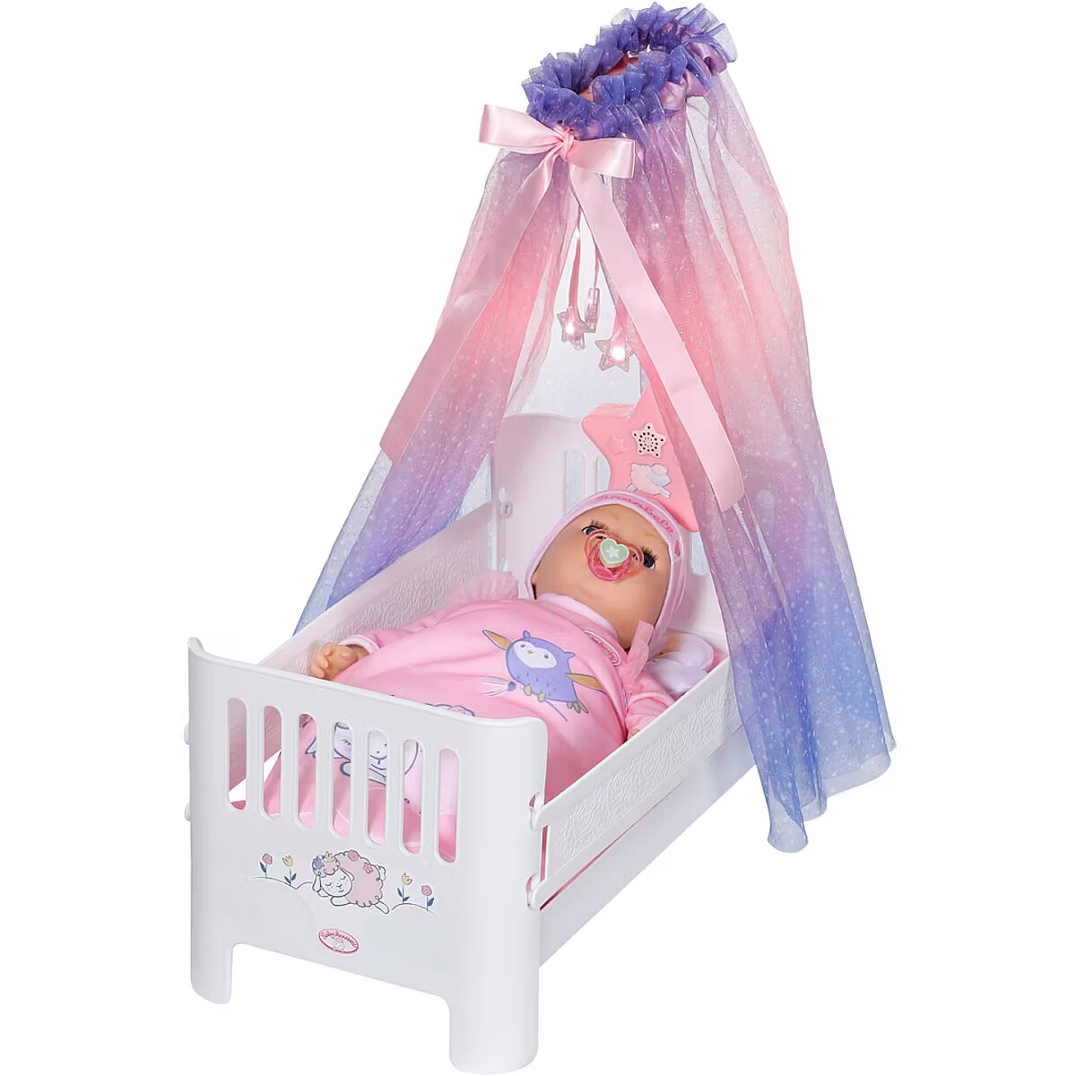 LongDesc - Baby Annabell’s new Sweet Dreams Bed is the perfect place for doll babies to doze off. The cosy cot with a cuddly blanket and fluffy cloud pillows plays a soothing melody to help the little one drift off into sleep. At the press of a button, the little star lights illuminate the canopy just like a real night sky. Even sleepy Baby Annabell is amazed. Good night Baby Annabell!• Original accessory for the Baby Annabell branded doll• The premium-quality accessories boost the imagination and offer new possibilities and stimuli for play• Requires batteries (not included)Baby Annabell Sweet Dreams Bed with night sky bed canopy and lullaby. Including mattress, blanket and pillows.
