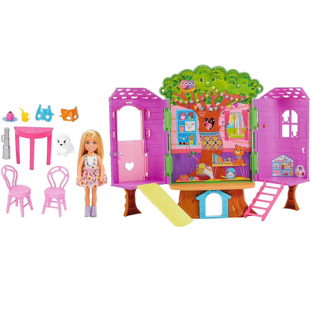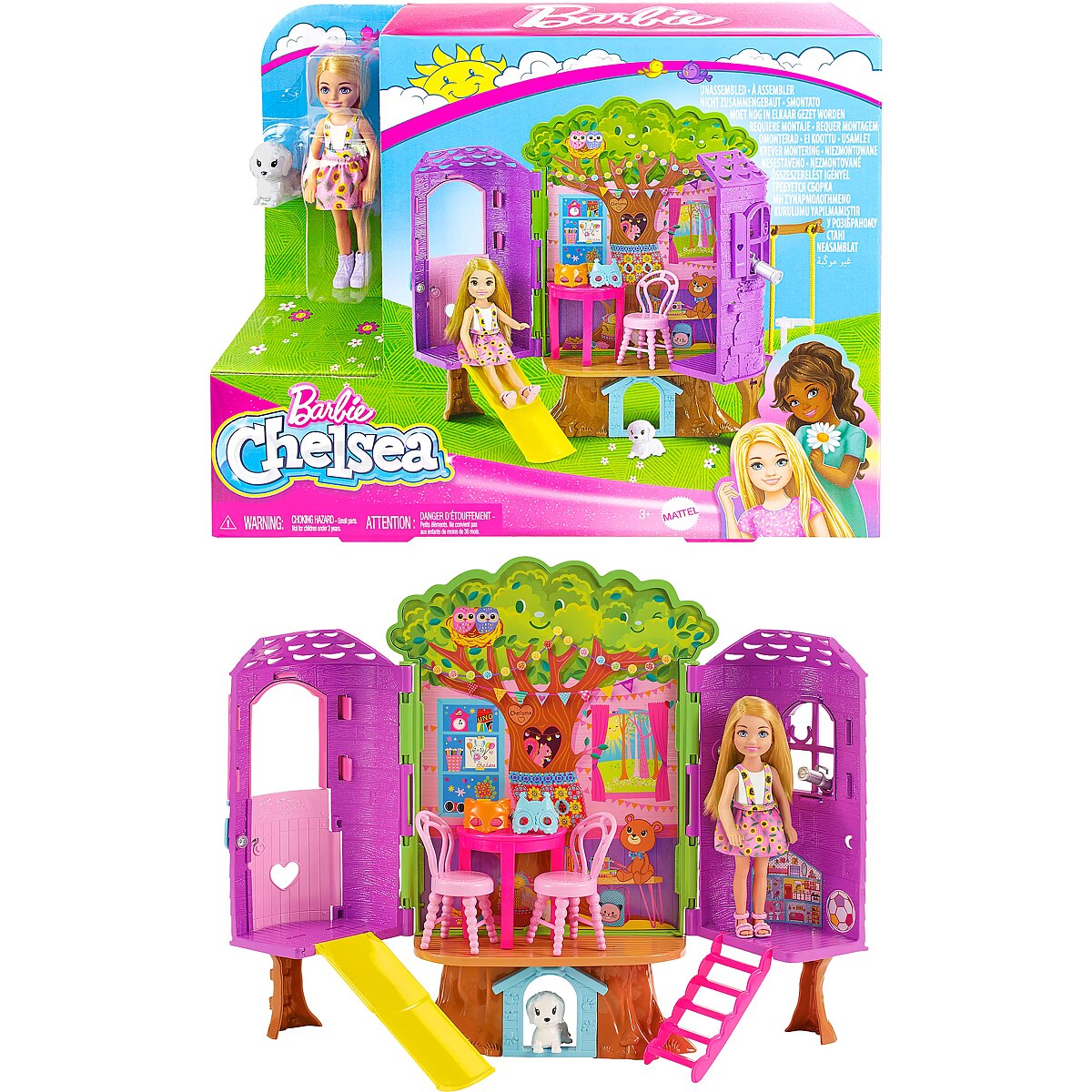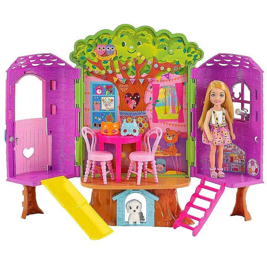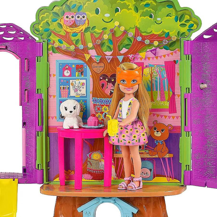 LongDesc - Ar šo Barbie Chelsea rotaļu komplektu, kas iedvesmots no koka mājas, bērni var atklāt koku lapotnes pasauli, kurā valda jautrība un piedzīvojumi. Tajā ir vairāk nekā 10 stāstu stāstošas detaļas un piecas dažādas rotaļu zonas komplektā iekļautajai lellei Chelsea. No lapsa maskas uzvilkšanas un izlikšanās līdz šūpošanās uz koka zara - tik daudz aktivitāšu viņu gaida, tiklīdz viņa uzkāps pa trepēm! Lelle nevar stāvēt atsevišķi. Krāsas un rotājumi var atšķirties.