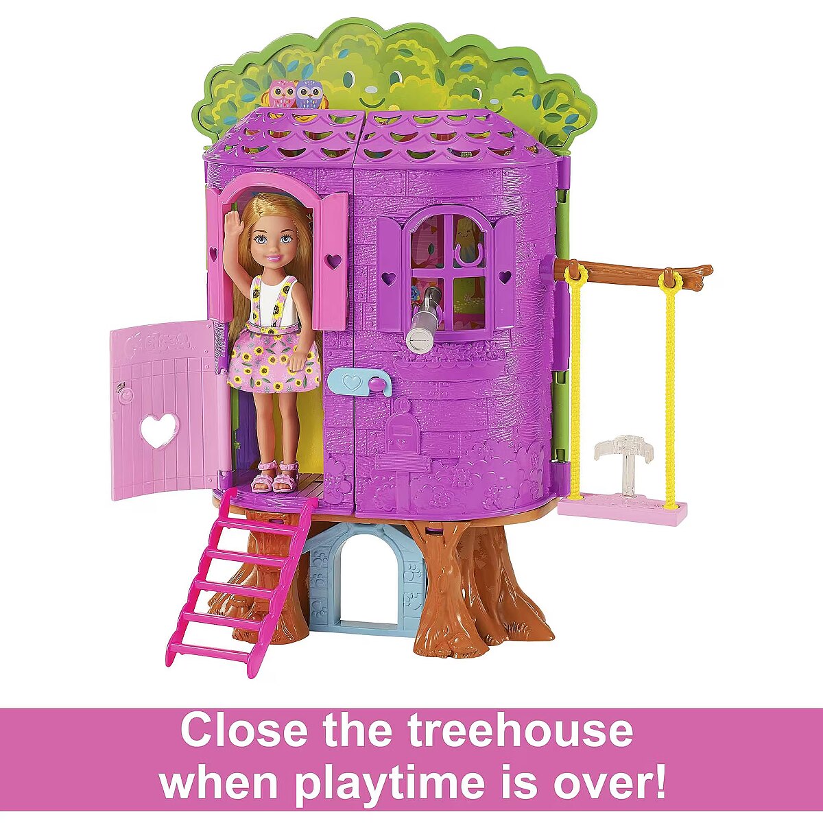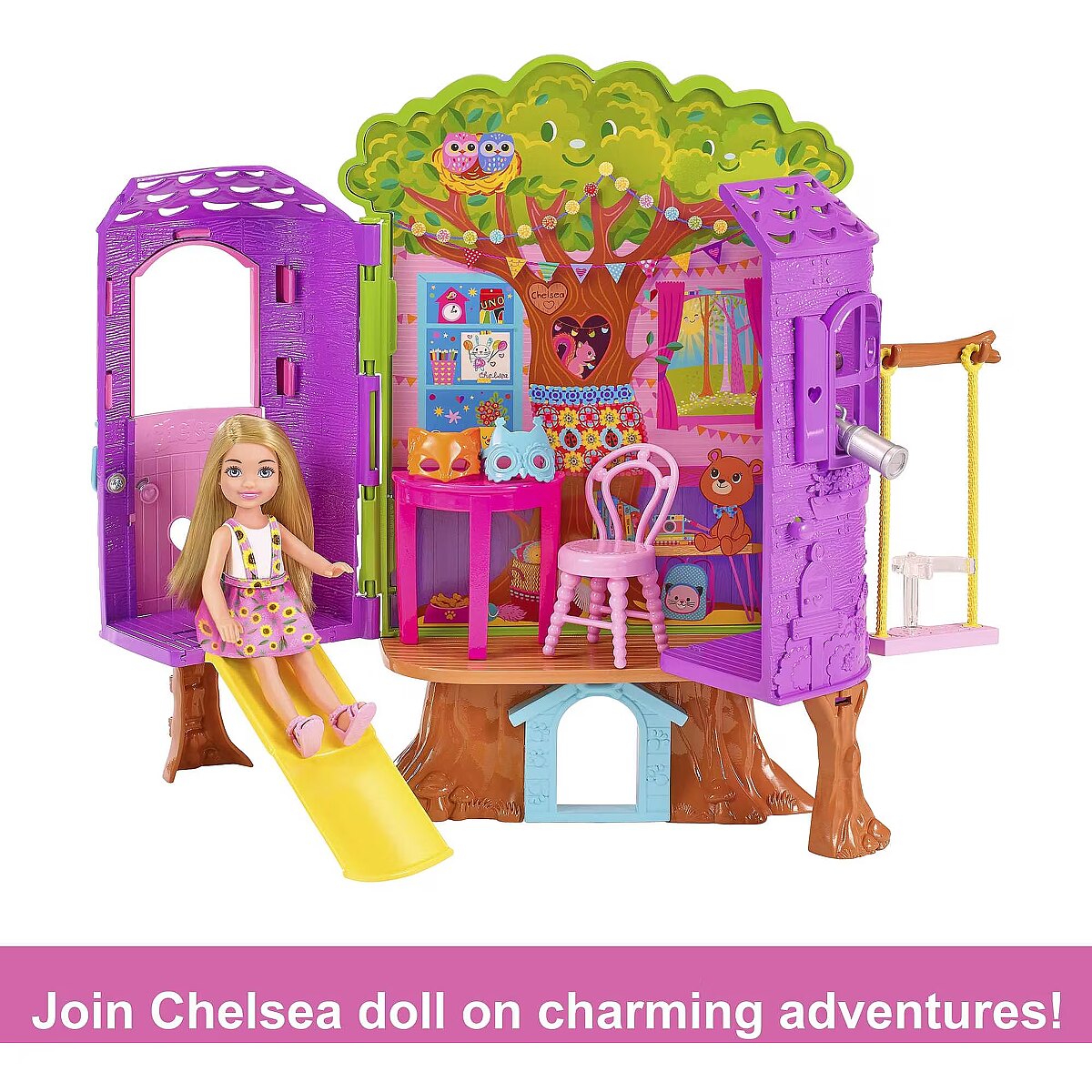 Description - Barbie Chelsea doll and tree house with puppy Children can explore a world full of games and discovery in the treetops with this Barbie Chelsea inspired tree house set. It includes over 10 storytelling elements and five different play elements for the Chelsea character. From creating a fox mask and pretending, to slithering up a tree branch when you reach the ladder, there's plenty of fun waiting for her! The doll cannot stand alone. Colours and decorations can happen. This Barbie treehouse set includes a Chelsea doll, puppy and adorable accessories for lots of imaginative fun! Chelsea doll is ready for a day of fun in a cute dress and floral shoes. Open the swinging door to the treehouse and send her up the ladder to get the adventure started! Open up the sides of the treehouse to reveal multiple play areas, or close it up for easy storage. There's even a puppy kennel in the tree trunk! Colourful storytelling elements add to the fun. Chelsea doll can play on the slide and swing, dress up in animal masks, enjoy a sweet snack and watch the stars through the telescope! Chelsea's sets include cute dolls and adorable details that will make a great gift for children aged 3 and up. Each sold separately, subject to availability.
