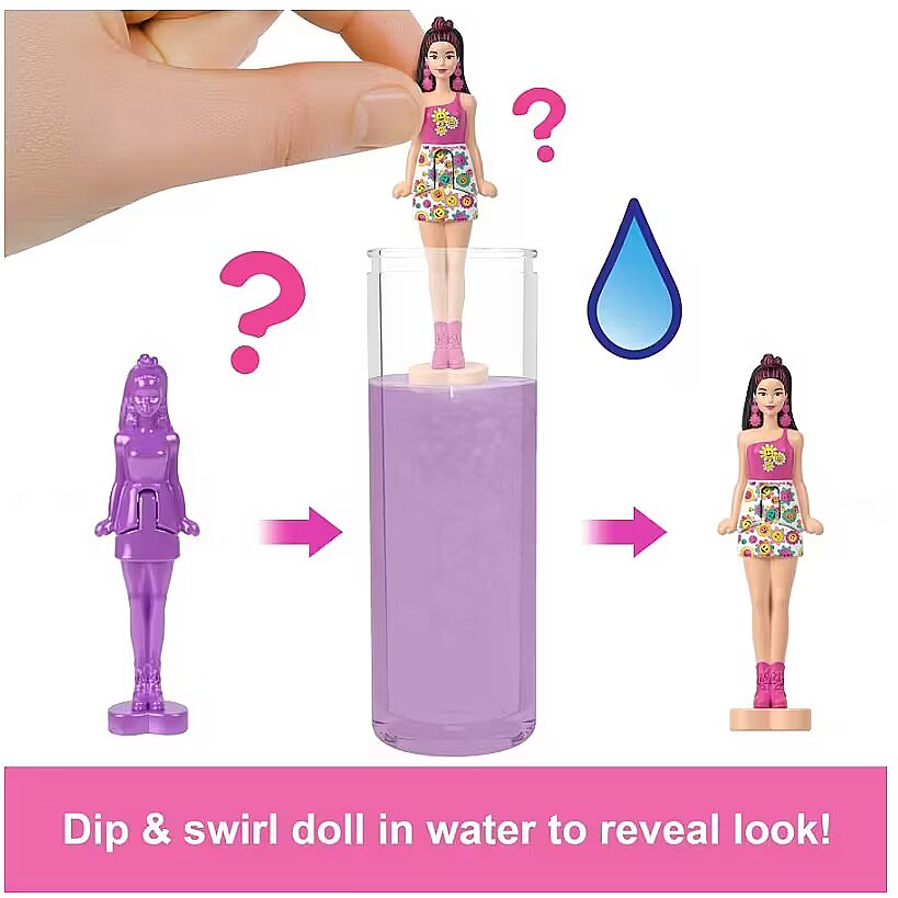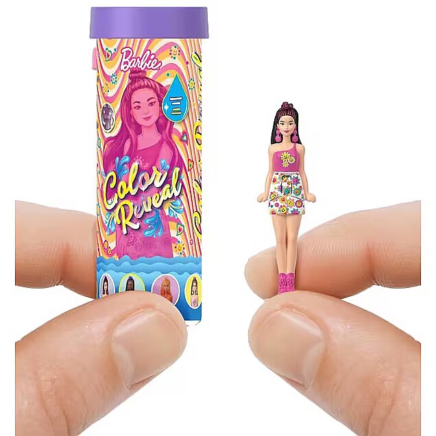 LongDesc - Enter the world of Barbie doll with Mini BarbieLand -- a place to imagine big and Dream in Mini! With Mini BarbieLand Colour Reveal dolls, there's big unboxing fun and a teeny surprise. Open the small tube, pull out a mini doll covered in a colourful coating, then use water as directed to see the doll's look -- so easy! Which doll will you reveal? Each 1.5-inch doll bends at the waist and stands on a heart-shaped base that fits into Mini BarbieLand playsets (sold separately). The mini packaging tube can also be used to store the doll. Fans ages 4 years and older will want to collect all these cute dolls to build their own mini world! Each sold separately, subject to availability. Colours and decorations may vary.
