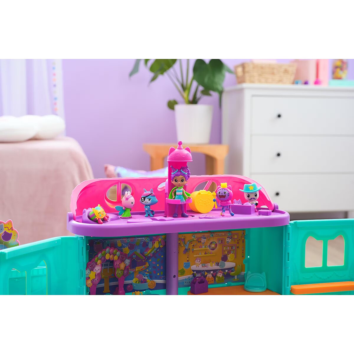 LongDesc - Step into the magical world of Gabby's Dollhouse with the Celebration Figure Gift Set! This exclusive figure set features Gabby and her favorite kitties like Pandy Paws, DJ Catnip, Catrat, Pillow Cat & Kitty Fairy! Then, unbox your very own dollhouse delivery to unveil the surprise toy, a delightful cape! For an added surprise, scan the QR code in the Dollhouse Delivery to unlock a special reward in the free Gabby’s Dollhouse App, available on iOS & Android. Gabby’s Dollhouse toys for girls & boys are great gifts for kids who are fans of the hit Netflix series and enjoy building pretend play doll house worlds. Make their entry into dollhouse play memorable with a world of lovable toy figures, dollhouse accessories and dollhouse furniture to collect and configure! Build your world with house kit essentials like a play kitchen or a music room, and tons of items to collect, like an awesome cruise ship toy, a mermaid themed pool and the all-new Party Room Playset - dollhouse attic with an indoor skate park, and super cute dollhouse balconies with mini fidget toys, that provide satisfying sensory play, and work seamlessly with both versions of the dollhouse!Includes: 1 Gabby Figure, 1 Pandy Paws Figure, 1 Catrat Figure, 1 DJ Catnip Figure, 1 Kitty Fairy Figure, 1 Pillow Cat, 1 Dollhouse Delivery, 1 Accessory