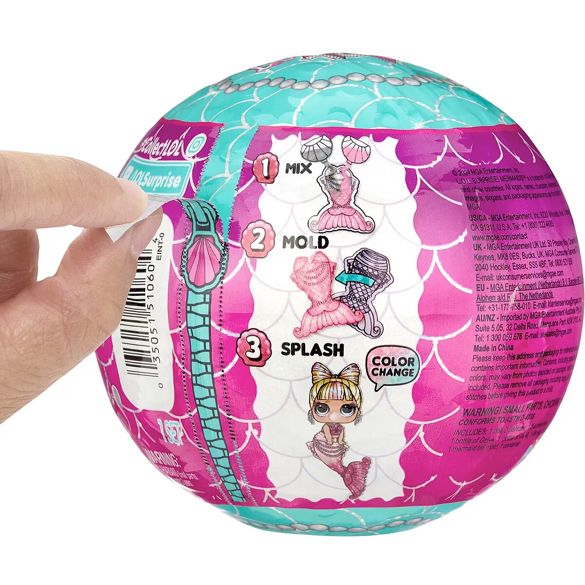 LongDesc - Gatavojieties uzspridzināties ar burvīgo LOL Surprise Mermaid! Tots, piedāvājot aizraujošu jaunu spēļu modeli, lai izveidotu savu nāras asti savam Totam!Tik samaisiet 2 krāsu želeju, ielejiet to astes veidnē un ļaujiet tai nostāvēties 30 minūtes, lai pārvērstos par krāsainu nāras asti! Kad Tots ir ietērpies savā satriecošajā jaunajā astē, iemērc to aukstā ūdenī, lai atklātu krāšņo krāsu maiņu! Šļakstiet un šļakstiet savā LOL bumbiņā, kas var kalpot kā akvāriņš vai karstā vanna jūsu gudrajām nāriņām!Savāc visas 8 LOL Surprise Mermaid! Tots!