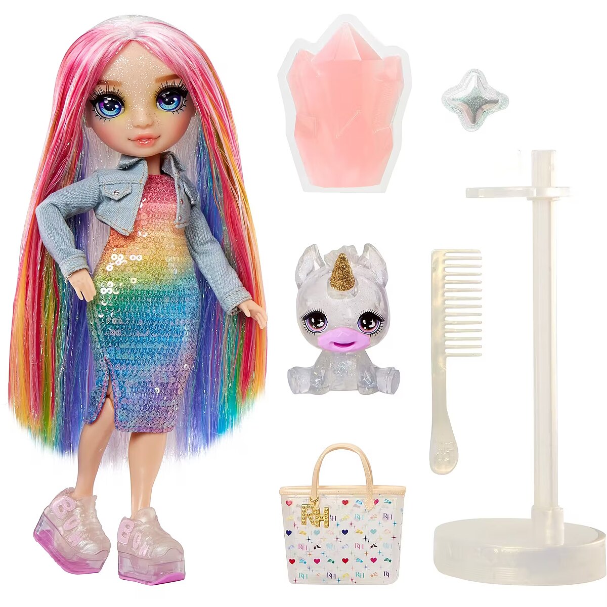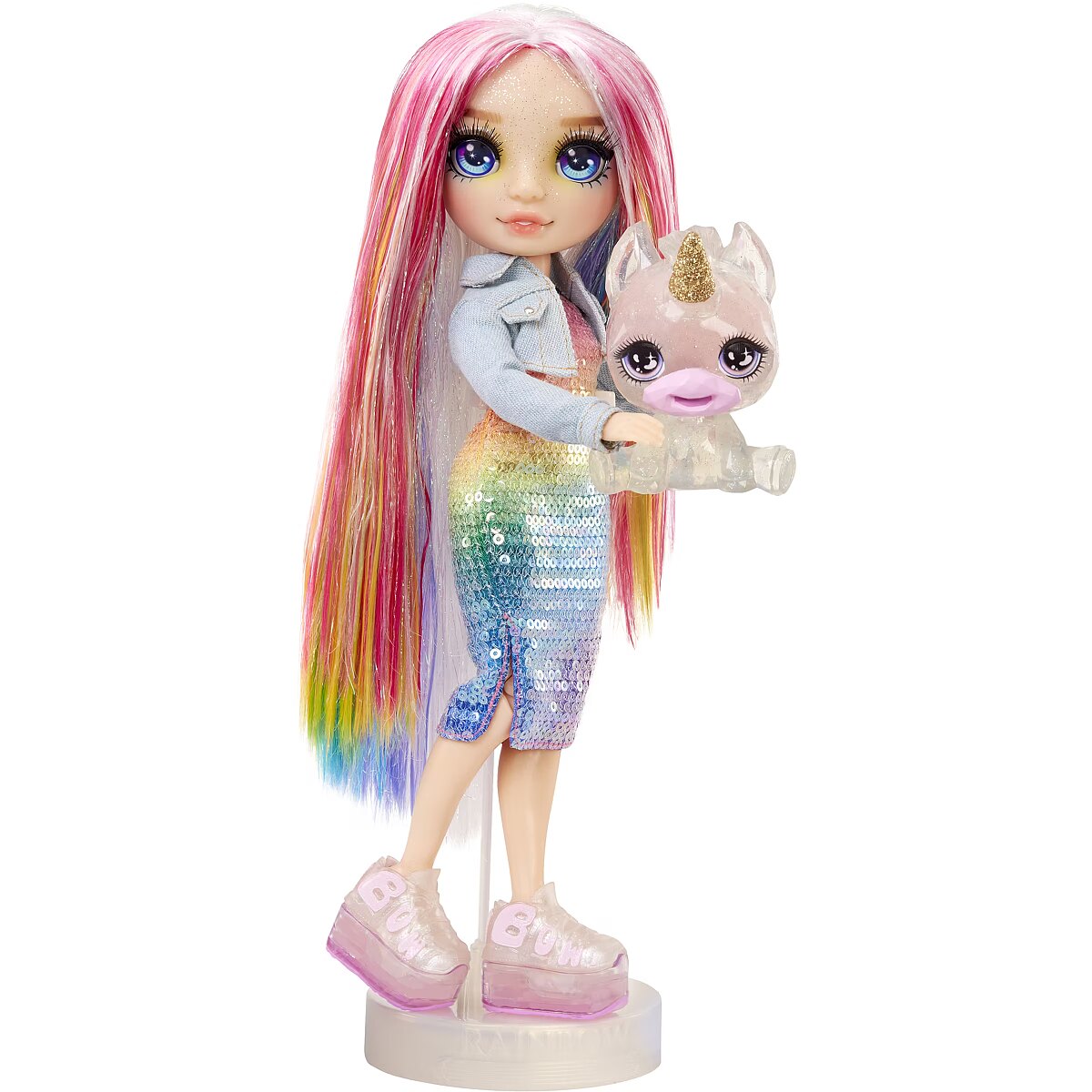 LongDesc - Create and play with your new colorful magical pet, fashion doll with customized accessories in a magical world. Kids will love creating their pretend play stories in Rainbow World, as seen in the hit animated series. The package makes for a perfect gift, it’s a doll + pet + slime. This playset inspires creativity and imagination.WATCH ON YOUTUBE and NETFLIX. Watch the new episodes of the Animated Series on YouTube. And catch up from the beginning on Netflix. Just search for ""Rainbow High”