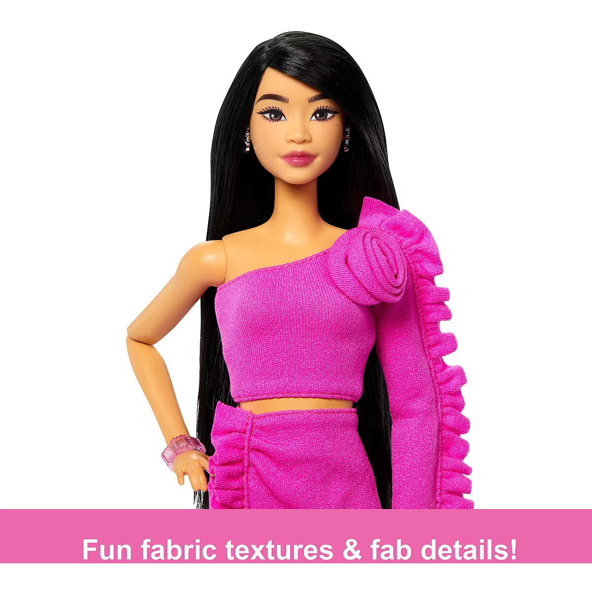 ShortSummaryDescription - Barbie Fashionistas Deluxe Style #2 lelle ar rozā Barbiecore topa un svārku komplektu, melniem matiem un kāju protēzēm, Modes lelle, sieviete, 4 gadi, meitene, 310 mm, 225 g