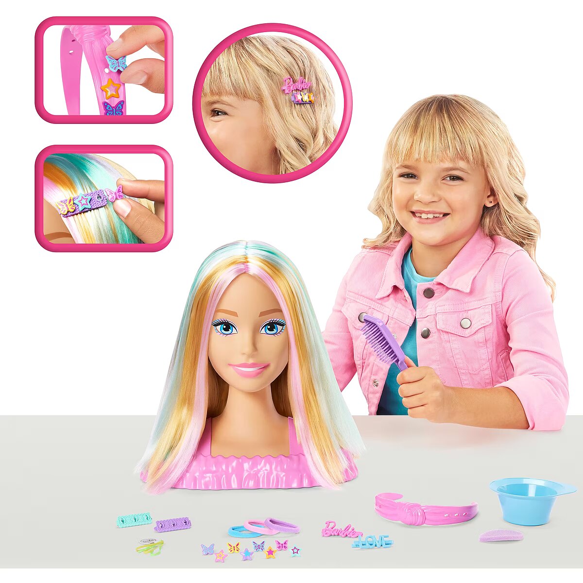 LongSummaryDescription - Barbie Doll Styling Head, Blonde Hair with 20+ Hair Styling Accessories. Doll type: Makeup/Styling doll head, Doll's gender: Female, Recommended age (min): 3 yr(s), Suggested gender: Girl. Height: 266 mm, Weight: 1.2 kg. Material: Plastic, Product colour: Multicolour