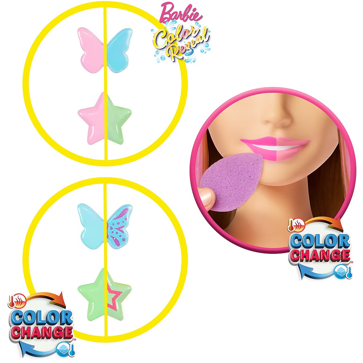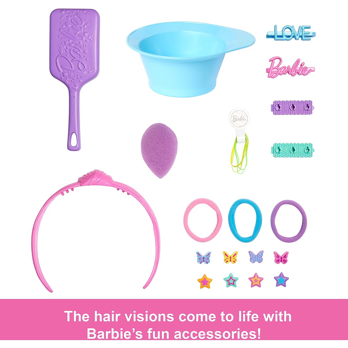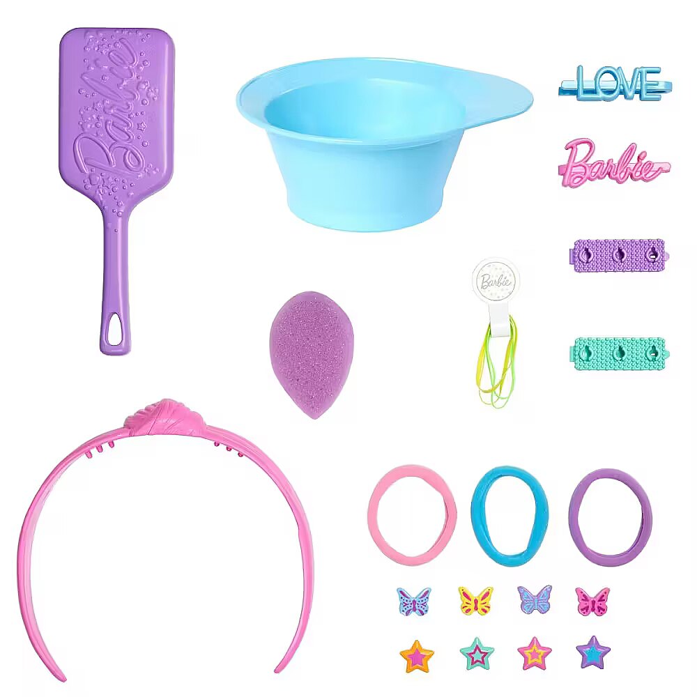 Accessories included - GĹowa do stylizacji z kolorowymi pasemkami 4 gwiazdki-przypinki ze zmianÄ koloru 4 motylki-przypinki ze zmianÄ koloru 4 spinki Szczotka Barbie Opaska do wĹosĂłw 3 gumki do wĹosĂłw 4 gumki-recepturki Miseczka GÄbeczka