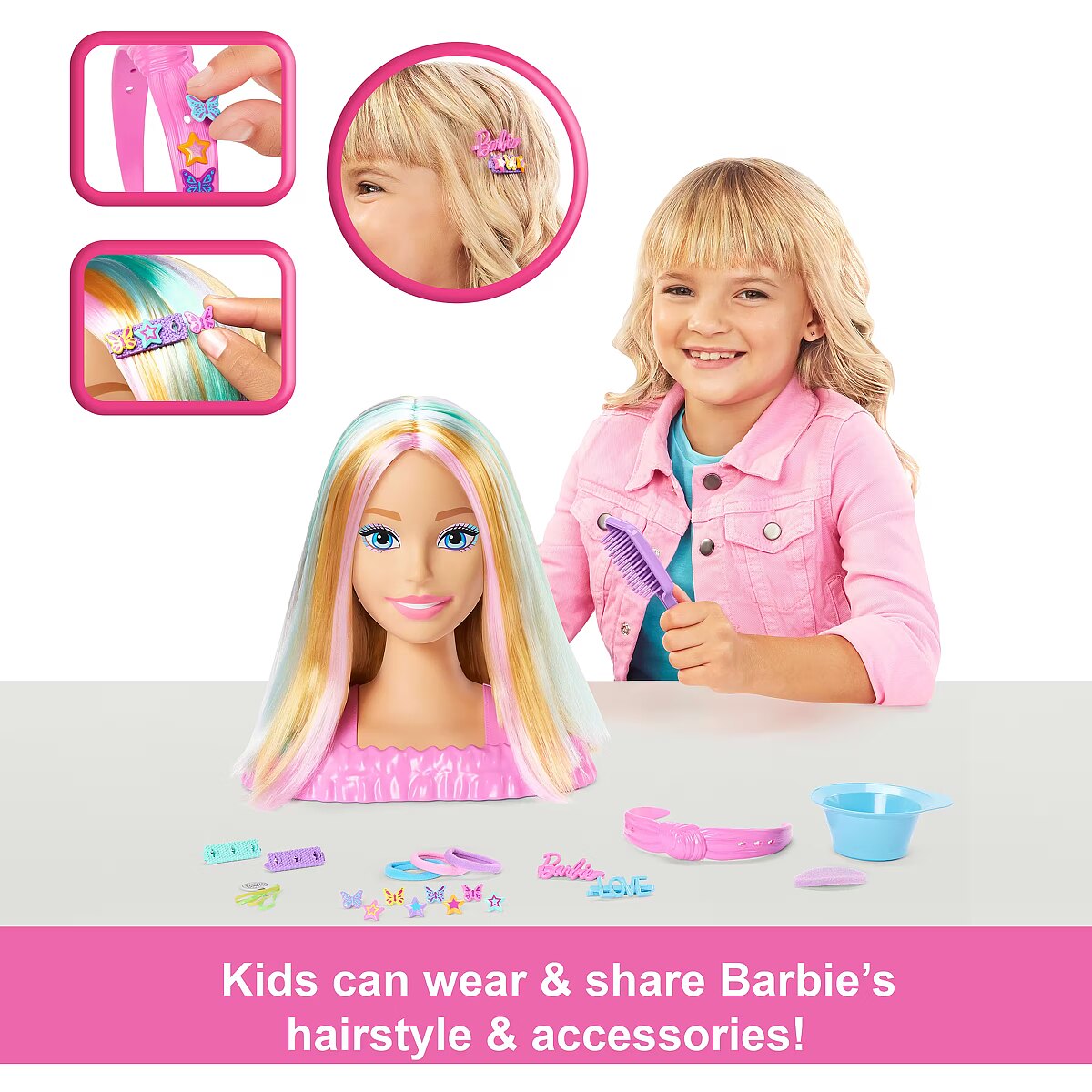 LongDesc - Become a hair expert with the colourful Barbie Doll Styling Head! Barbie has blonde hair with pastel pink, orange, and turquoise streaks through her hair! Including a bowl and sponge to help with colour change reveals, Barbie can make her hair clips match her colourful hair. Her other colourful accessories, like her hairbrush, hair ties, and barrettes, help kids make their artistic hair visions come to life! This styling head makes a great gift for kids ages 3 years old and up! Colours and decorations may vary.