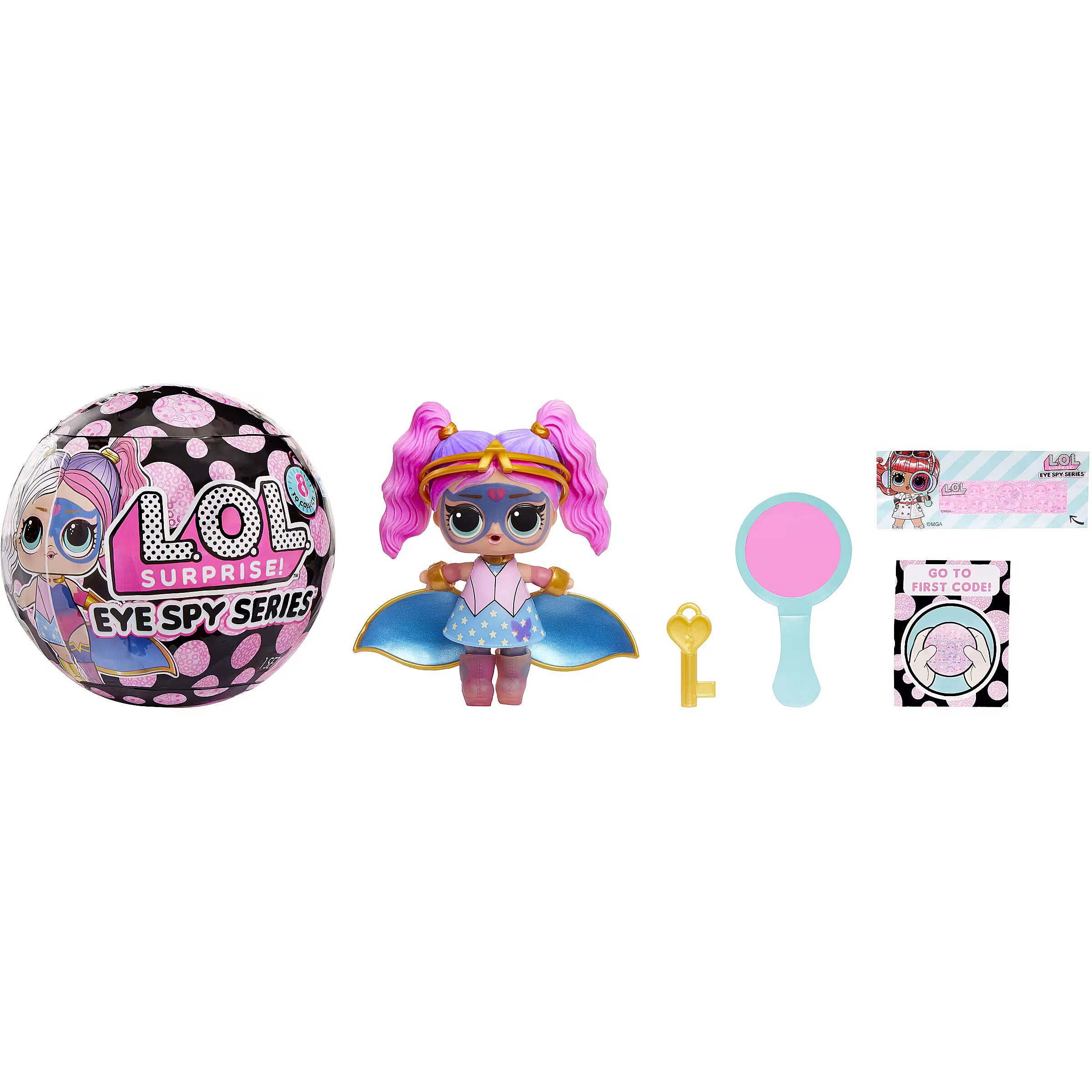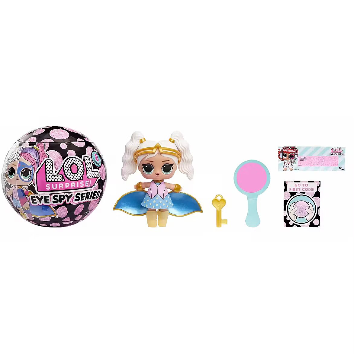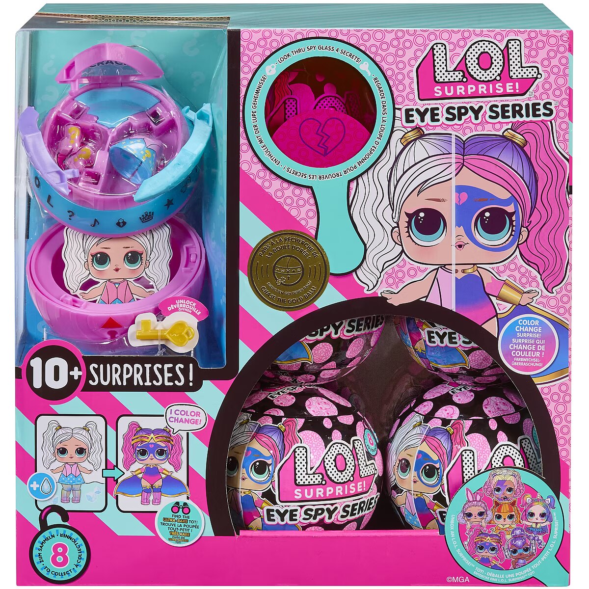 LongDesc - L.O.L. Surprise! is bringing you the most fabulous, interactive unboxing experience ever! Step into the world of surprises where you will need to crack codes, solve clues, and unlock secrets one by one to unbox cute fashions, accessories, and more! Each clue will lead you closer to the key to reveal the ultimate surprise - a beautiful NEW Tot doll with amazing color change features! Look for the Ultra-Rare gold ball holding the Spy chase character! Collect all 8 adorable dolls!