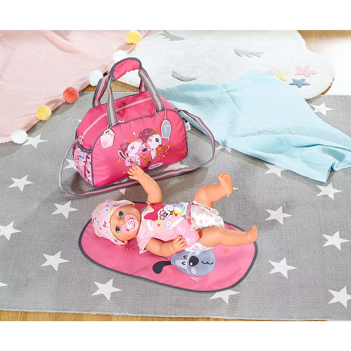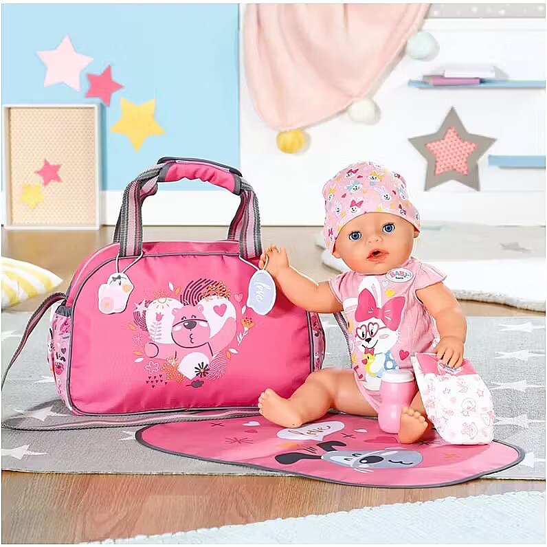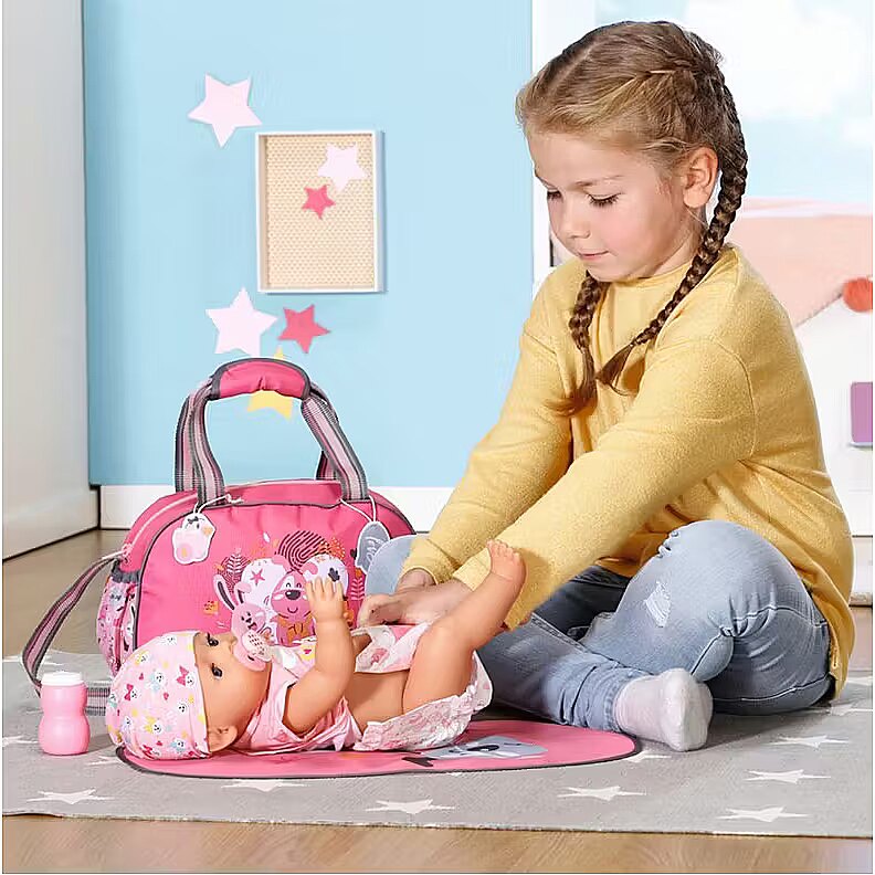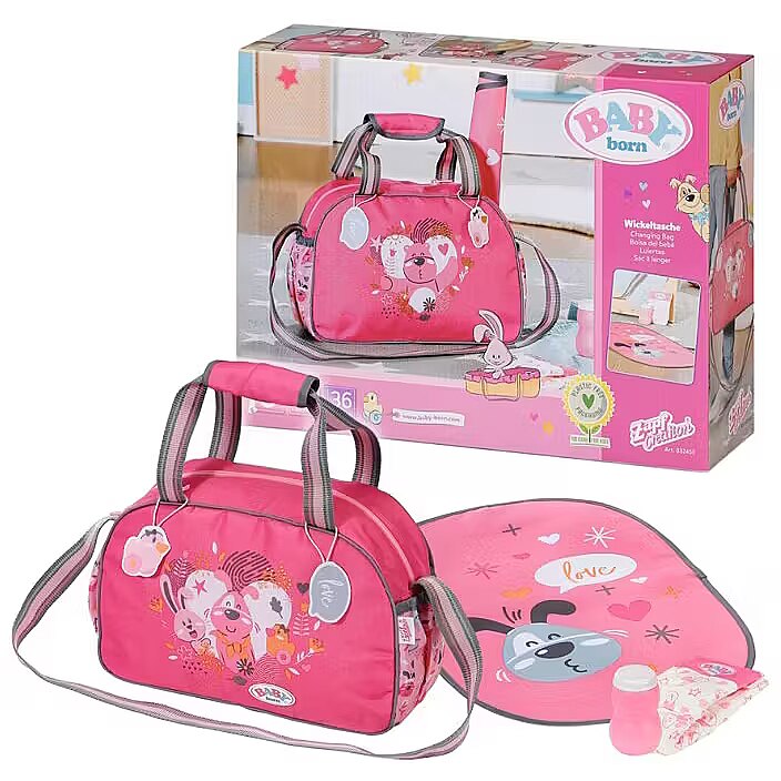 Description - BABY born Torba na pieluchy z akcesoriami BABY born cieszy się na każde wyjście, podobnie jak jej przyjaciele - zwierzątka, których wizerunki widnieją na przewijaku. Uuuups z tej ekscytacji właśnie zrobiła siusiu. Jakie to szczęście, że pod ręką zawsze jest przewijak. Jet w nim wszystko, czego potrzebuje dziecko: mata do przewijania, pieluszka i pojemnik z pudrem. Jest także miejsce na butelkę z napojem, rozkład jazdy autobusów i zebrane po drodze skarby. Przewijak można komfortowo przenosić trzymając w ręku lub wieszając na ramieniu. Do pasków doczepiono urocze zawieszki, którymi BABY born może się bawić podczas przewijania. Wysokiej jakości akcesoria do oryginalnych lalek BABY born. Dla ciekawszej, różnorodnej i niekończącej się zabawy. Odpowiednie dla lalek w rozmiarze 36 cm i 43 cm.