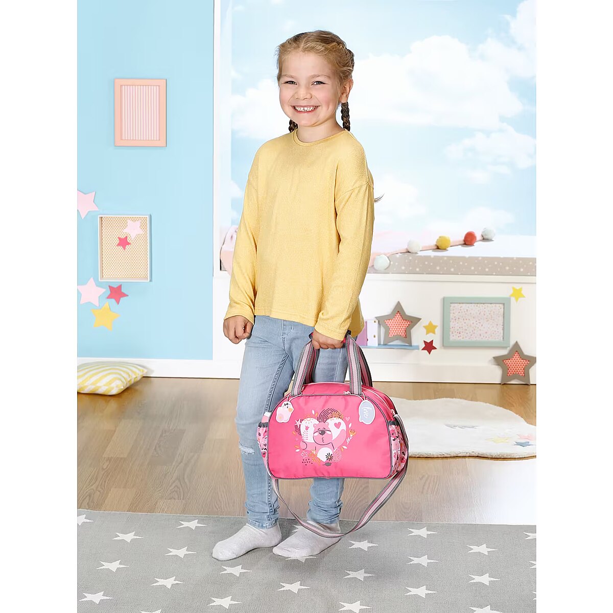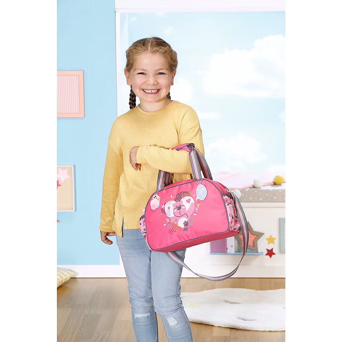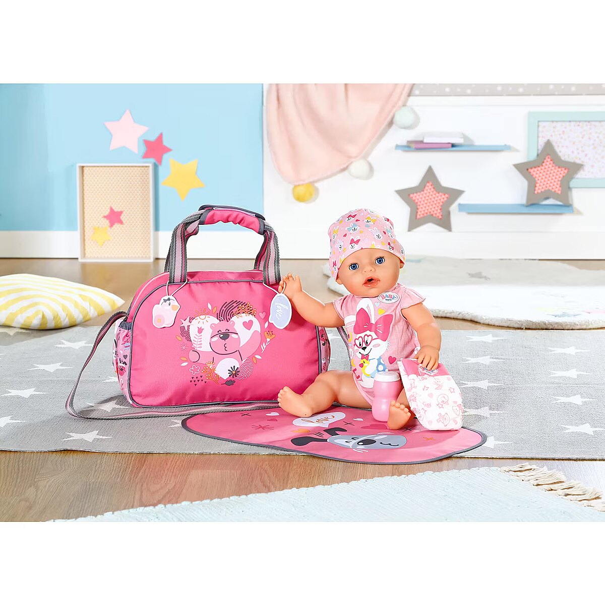 Description - BABY born Torba na pieluchy z akcesoriami BABY born cieszy się na każde wyjście, podobnie jak jej przyjaciele - zwierzątka, których wizerunki widnieją na przewijaku. Uuuups z tej ekscytacji właśnie zrobiła siusiu. Jakie to szczęście, że pod ręką zawsze jest przewijak. Jet w nim wszystko, czego potrzebuje dziecko: mata do przewijania, pieluszka i pojemnik z pudrem. Jest także miejsce na butelkę z napojem, rozkład jazdy autobusów i zebrane po drodze skarby. Przewijak można komfortowo przenosić trzymając w ręku lub wieszając na ramieniu. Do pasków doczepiono urocze zawieszki, którymi BABY born może się bawić podczas przewijania. Wysokiej jakości akcesoria do oryginalnych lalek BABY born. Dla ciekawszej, różnorodnej i niekończącej się zabawy. Odpowiednie dla lalek w rozmiarze 36 cm i 43 cm.