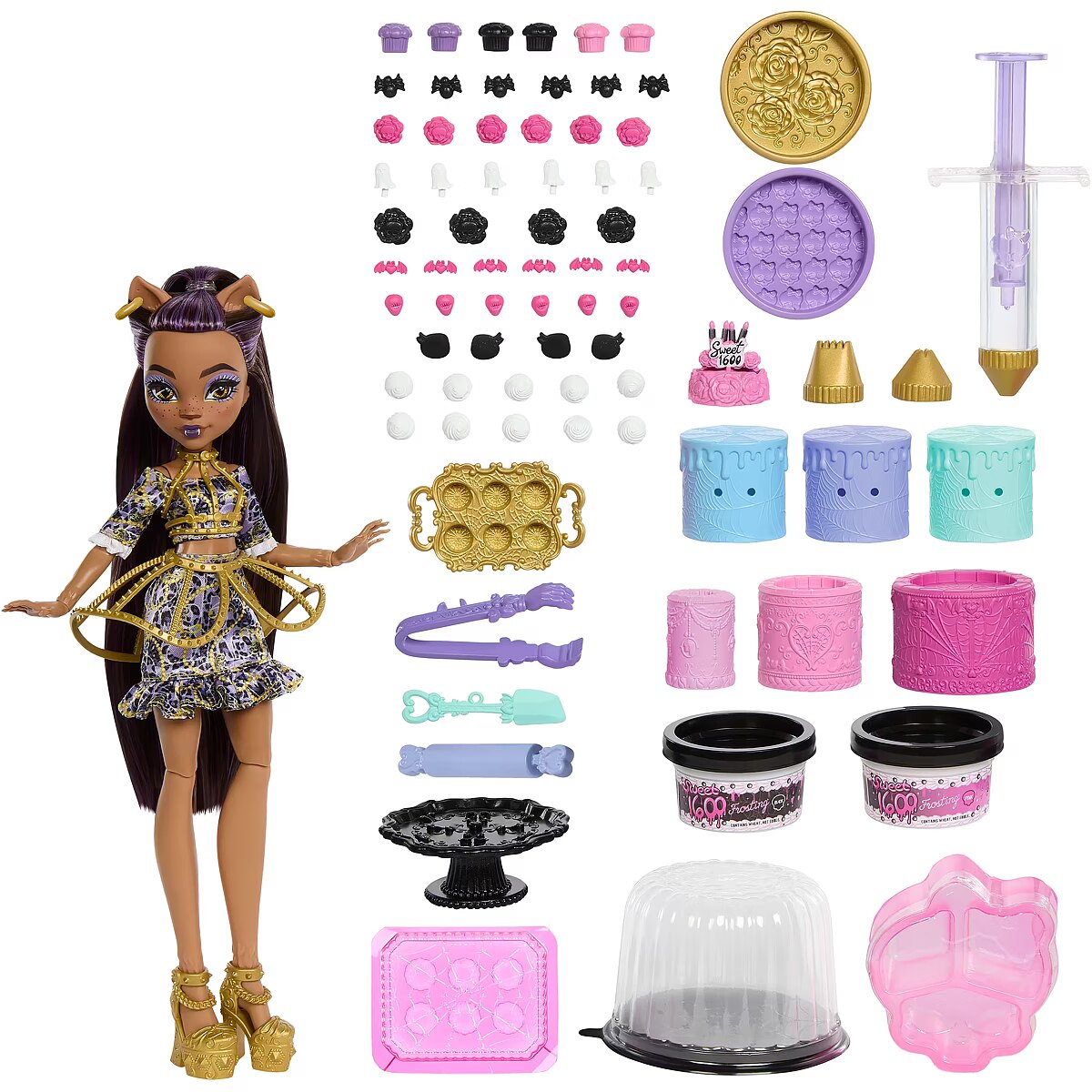 Iepakojuma saturs - Iepakojuma saturs - Komplektā ietilpst 1 Clawdeen Wolf lelle, 6 kūkas, 6 cupcakes, 1 cupcake paplāte, 1 lāpstiņa, 1 rullītis, 1 knaiblīšu pāris, 2 kūkas veidnes, 1 glazūras pipete, 3 glazūras sprauslas un daudz kūkas papildinājumu piederumu. Mīkla nav ēdama. Lelle nevar stāvēt atsevišķi. Krāsas un rotājumi var atšķirties.
