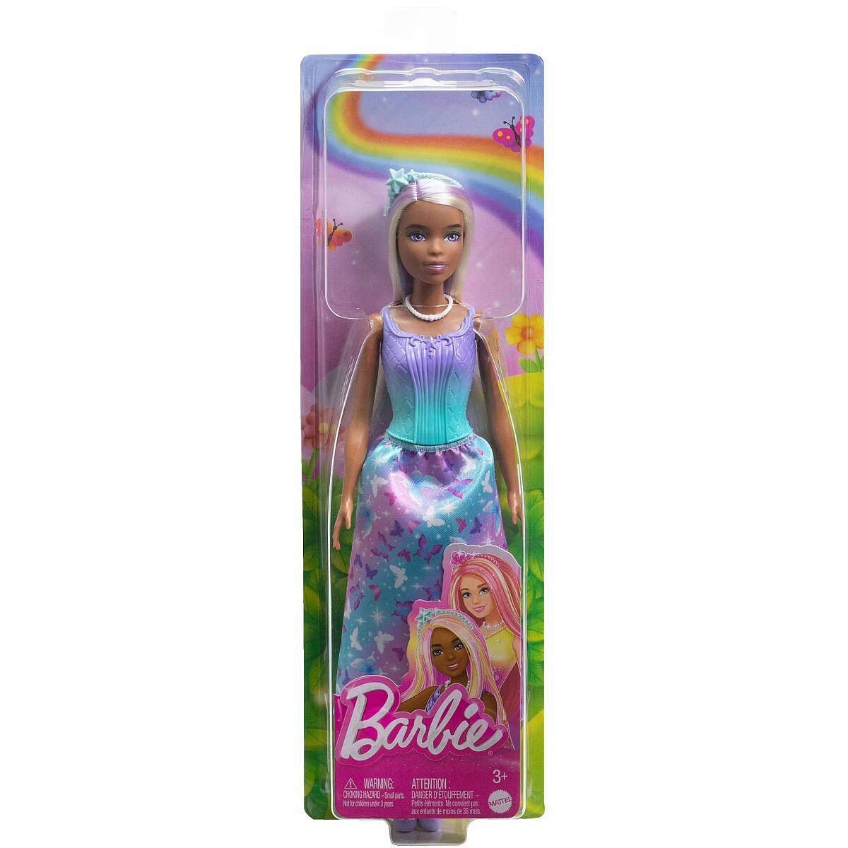 LongSummaryDescription - Barbie Royal Doll with Purple-Highlighted Hair, Butterfly-Print Skirt & Accessories. Doll type: Fashion doll, Doll's gender: Female, Recommended age (min): 3 yr(s), Suggested gender: Girl. Height: 280 mm, Weight: 120 g. Material: Fabric, Plastic, Product colour: Multicolour
