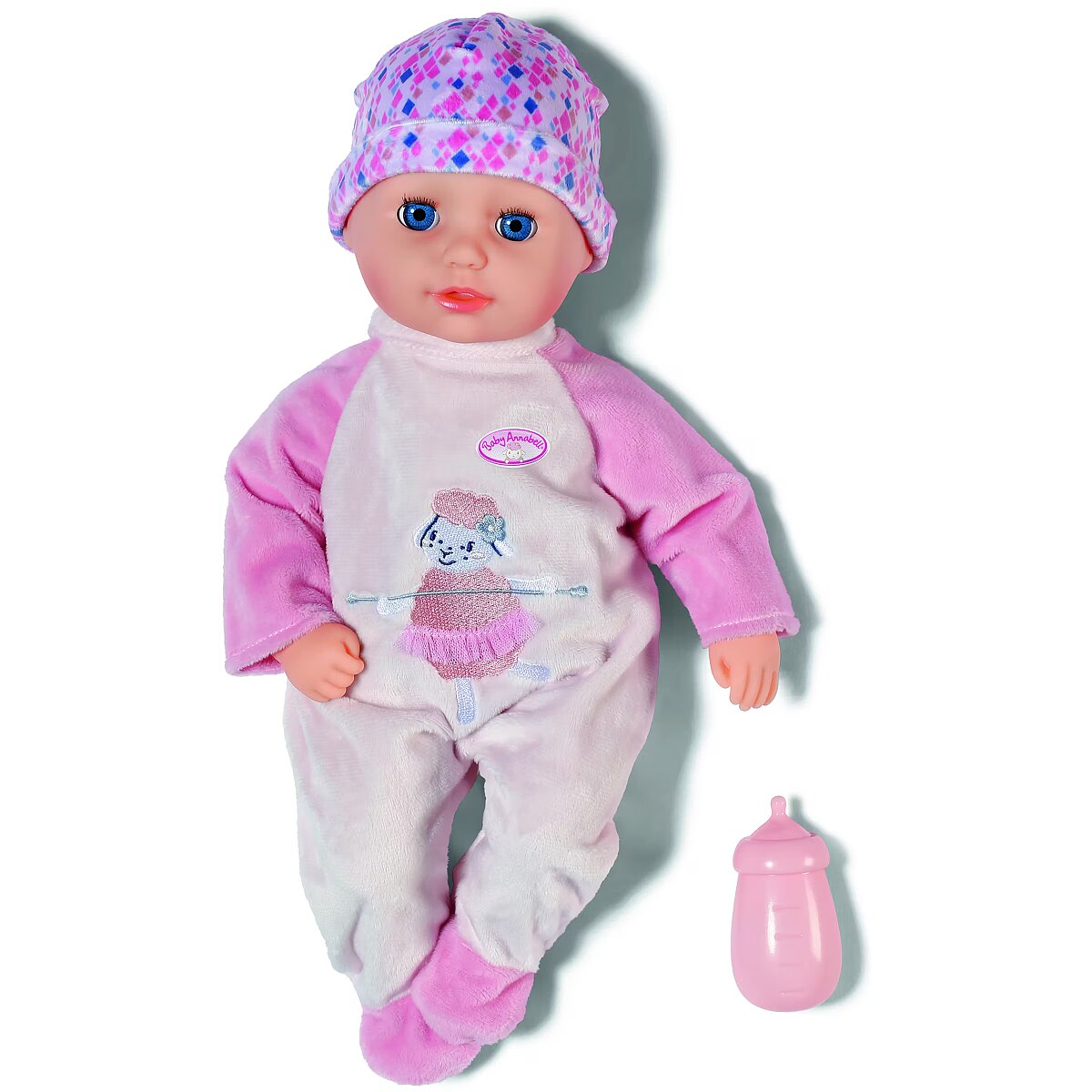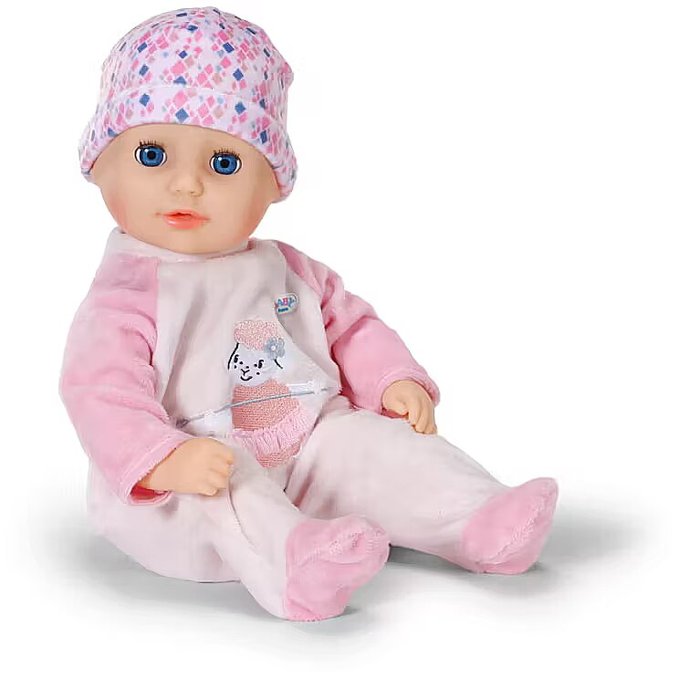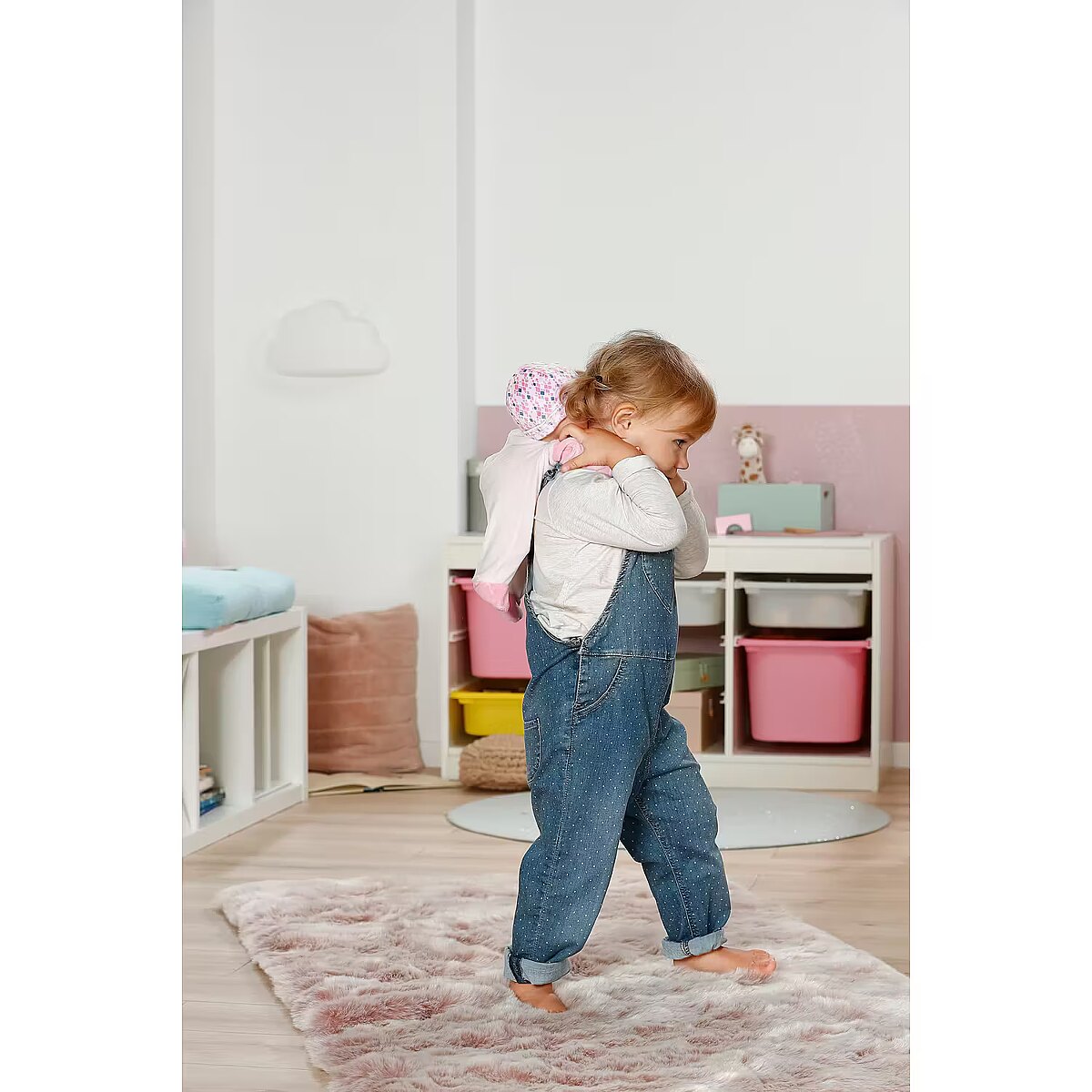 LongDesc - BABY born Anna Rose invites you to cuddle with her soft fabric body and is the ideal first playmate for the little ones with her handy size. If you lay her down for an afternoon nap after her bottle, her sleeping eyes close gently as if she were falling asleep peacefully. In addition to her bottle, Anna also brings a lovingly designed romper that enchants with delicate colors and cute details. The pink sleeves and feet set particularly pretty accents. A matching hat rounds off her outfit perfectly and makes her ready for every adventure and cuddle. Everything from BABY born in size 36cm fits her.