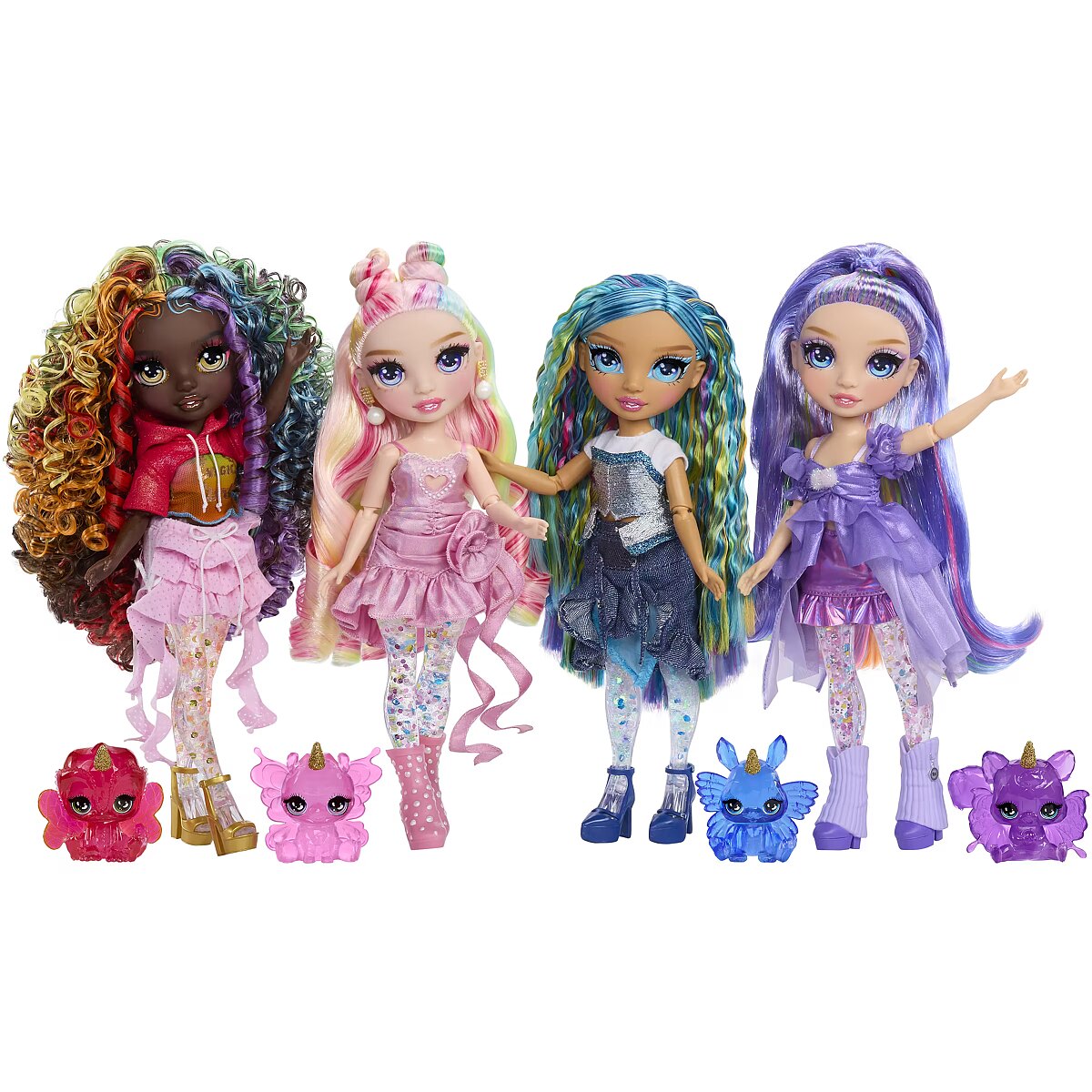 LongDesc - Rainbow High is more magical than ever—now you can create your own Rainbow Doll! The Rainbow High Rainbow Shimmers set includes a slime kit, allowing you to mix and customize dazzling colors, textures, and shapes. Use the slime to create a unique rainbow effect in your doll’s legs, transforming her look with shimmering hues.She also features stunning rainbow highlights woven throughout her hair, along with delicate eyelashes and mesmerizing glass eyes that make her truly stand out. Like all Rainbow High Fashion Dolls, she boasts exquisite details and full articulation, making her easy to pose, style, and play with.But the magic doesn’t stop there! She also comes with an adorable pet, complete with wings and a horn, adding even more charm to your rainbow adventure!Collect all the friends: Iris in Rainbow, Bella in Pink, Skyler in Blue and Violet in Purple.