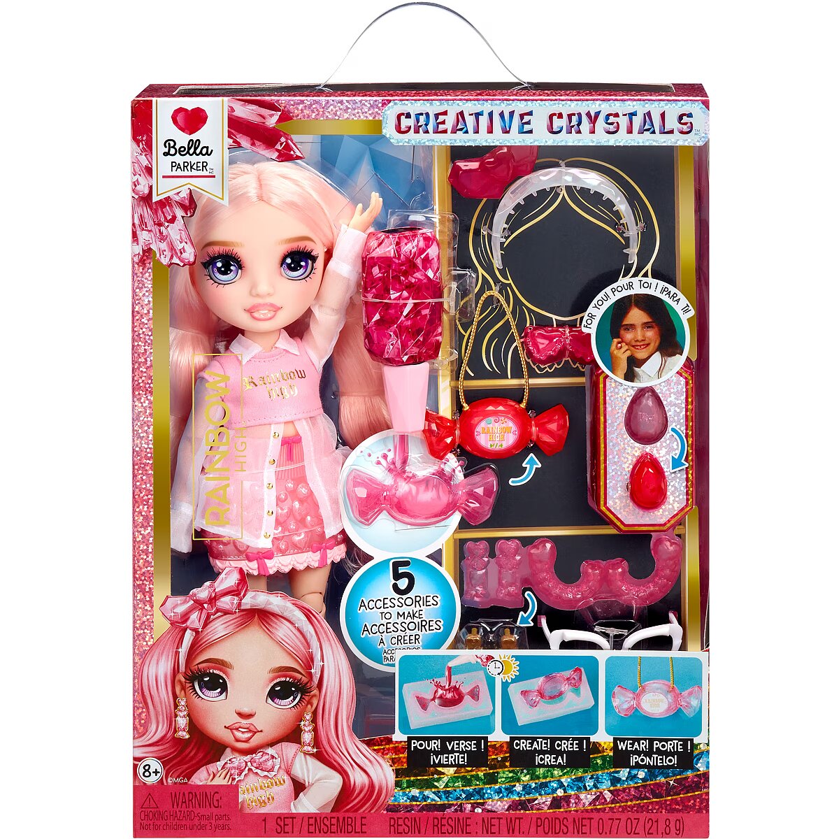 LongProductName - Rainbow High Creative Crystals Bella - Rozā 11" modes lelle ar kristāla aksesuāru Make It Kit, gredzens jums, DIY, amatniecība, Resin Play, dāvana bērniem 8+