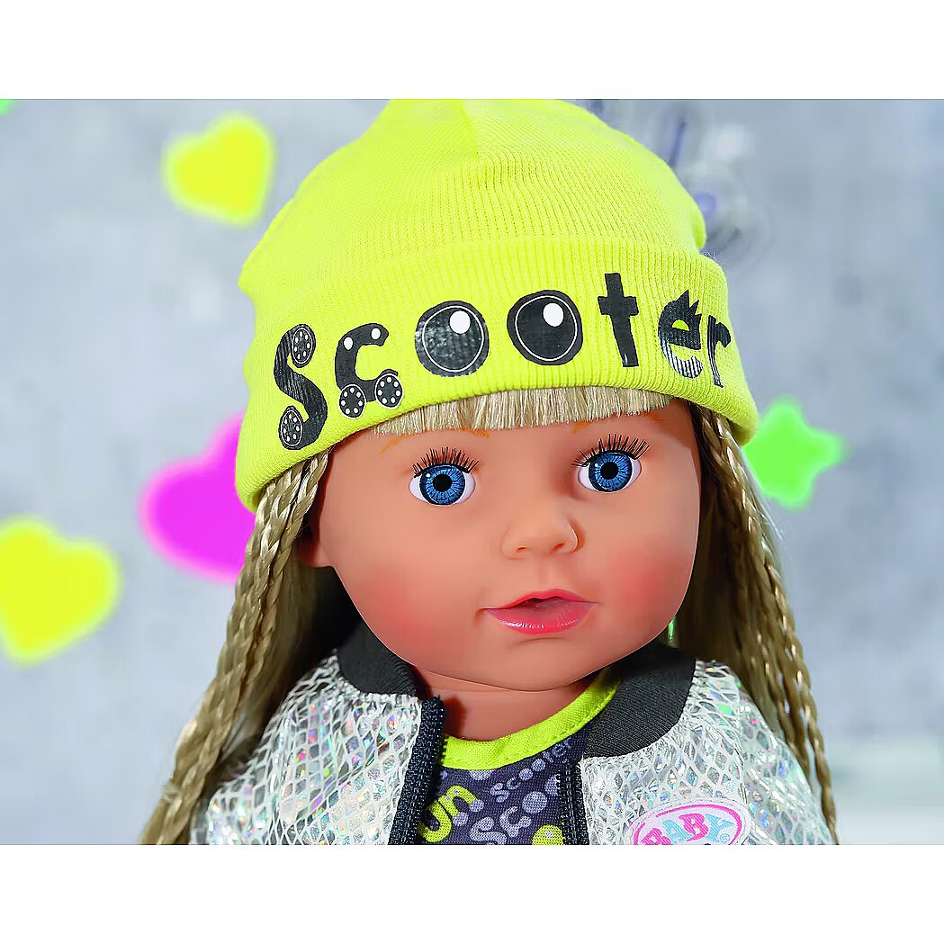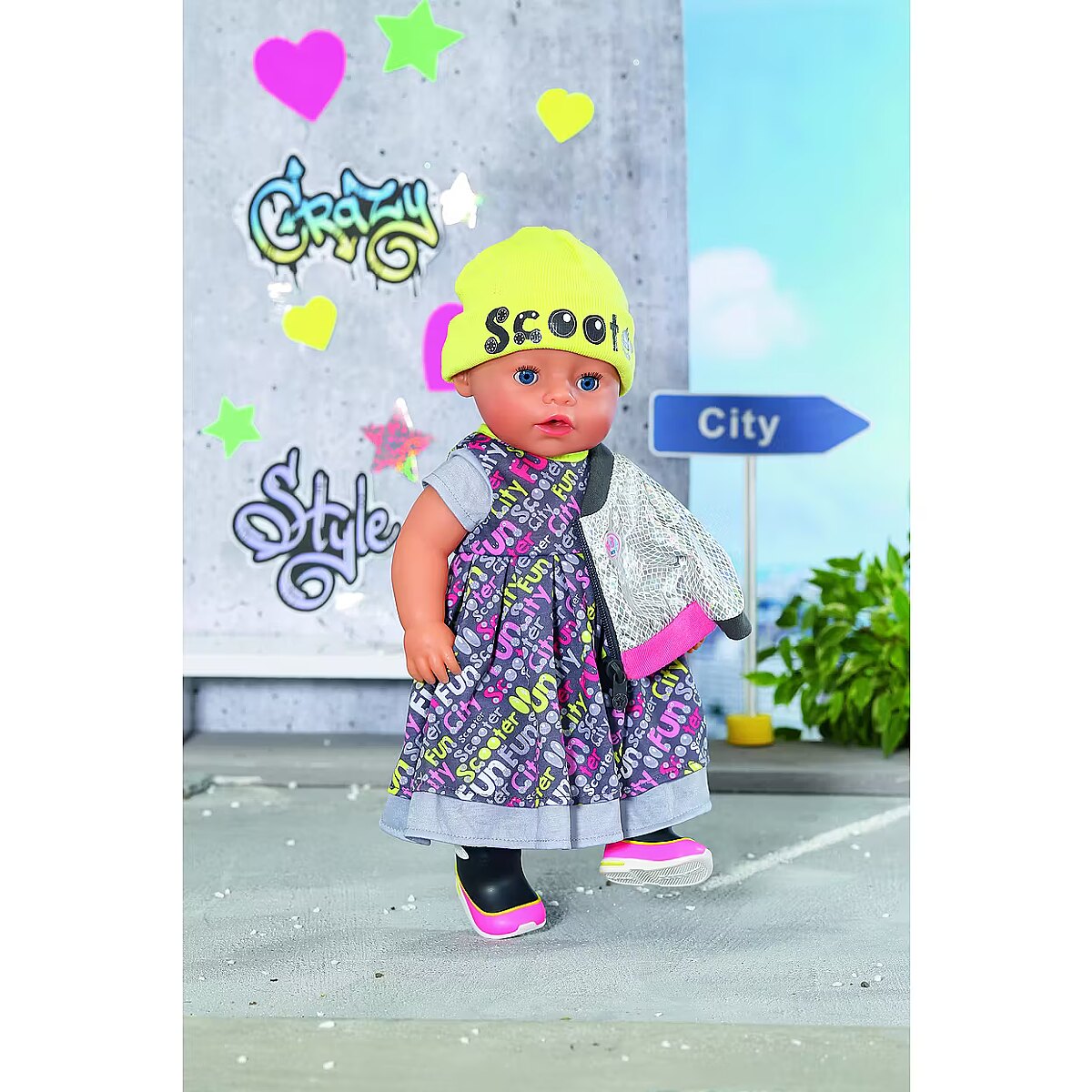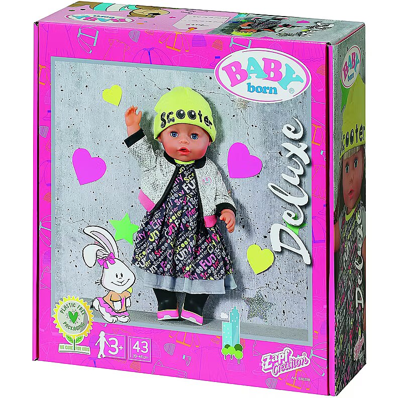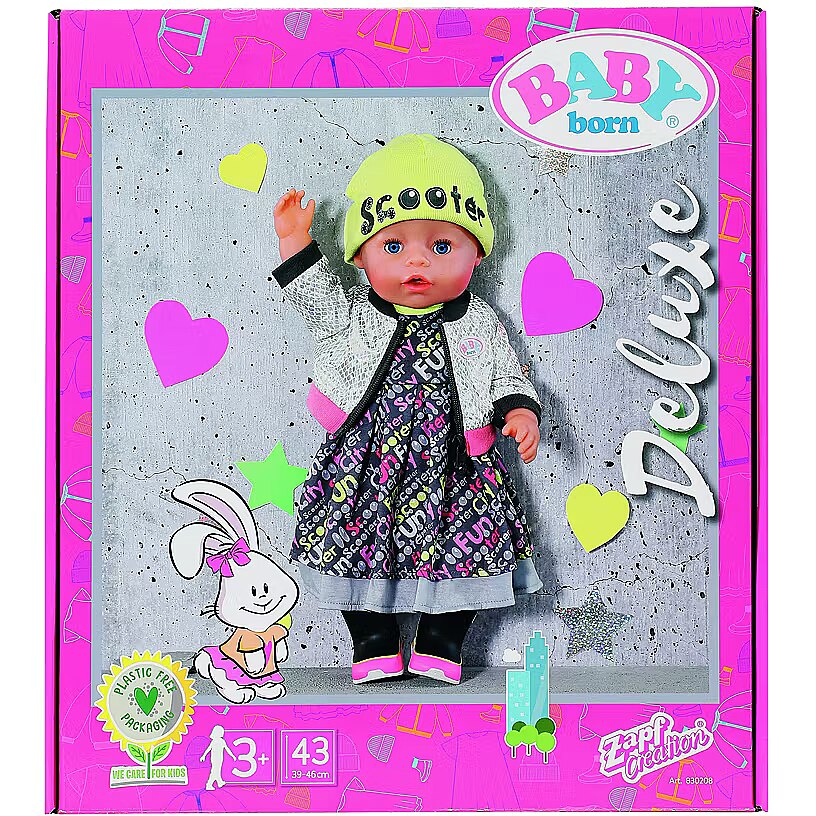 Technical_details - BABY born® City Deluxe Style 43 cm, doll accessories Such a trip to the city has style. With the dress in a layered look, BABY born is particularly fashionable when out and about. Most of the time, the brother drives them to the city meeting point in a scooter. So that the helmet doesn't destroy the hairstyle, she puts on the yellow cap underneath. She wears the jacket with the silver diamond pattern to protect herself from the wind. The colour-contrasting cuffs and the zipper go perfectly with the lettering print of the dress. The cool boots pick up the colors and complement the look. Type: Doll Accessories EAN code: 4001167830208 Manufacturer number: 830208 Series: BABY born® Contents/Equipment: BABY born City Deluxe Style 43cm with dress, jacket, hat and boots Age recommendation: from 36 months Target group: kindergarten children Material: fabric Warnings: Caution: Not suitable for children under 36 months! Warnings: Attention: Danger of suffocation due to small parts!
